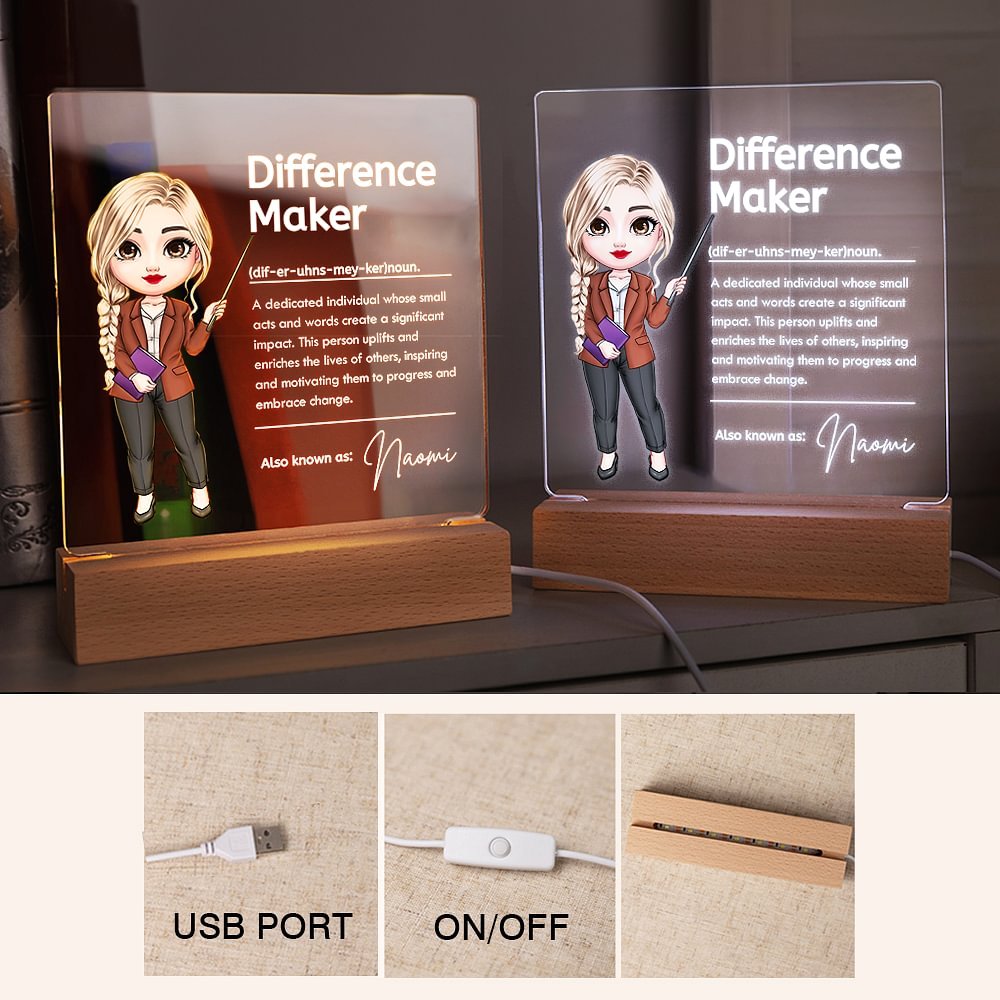 La nostra luce notturna combina abilmente la parola di energia positiva "Difference Maker" con l'immagine di un insegnante dei cartoni animati, che non solo mostra l'eccezionale contributo del destinatario al campo dell'istruzione, ma conferisce anche vivacità e divertimento agli ornamenti grazie all'immagine dei cartoni animati. Inoltre, la luce notturna offre anche un servizio di personalizzazione del nome, che la rende più unica e un souvenir esclusivo.