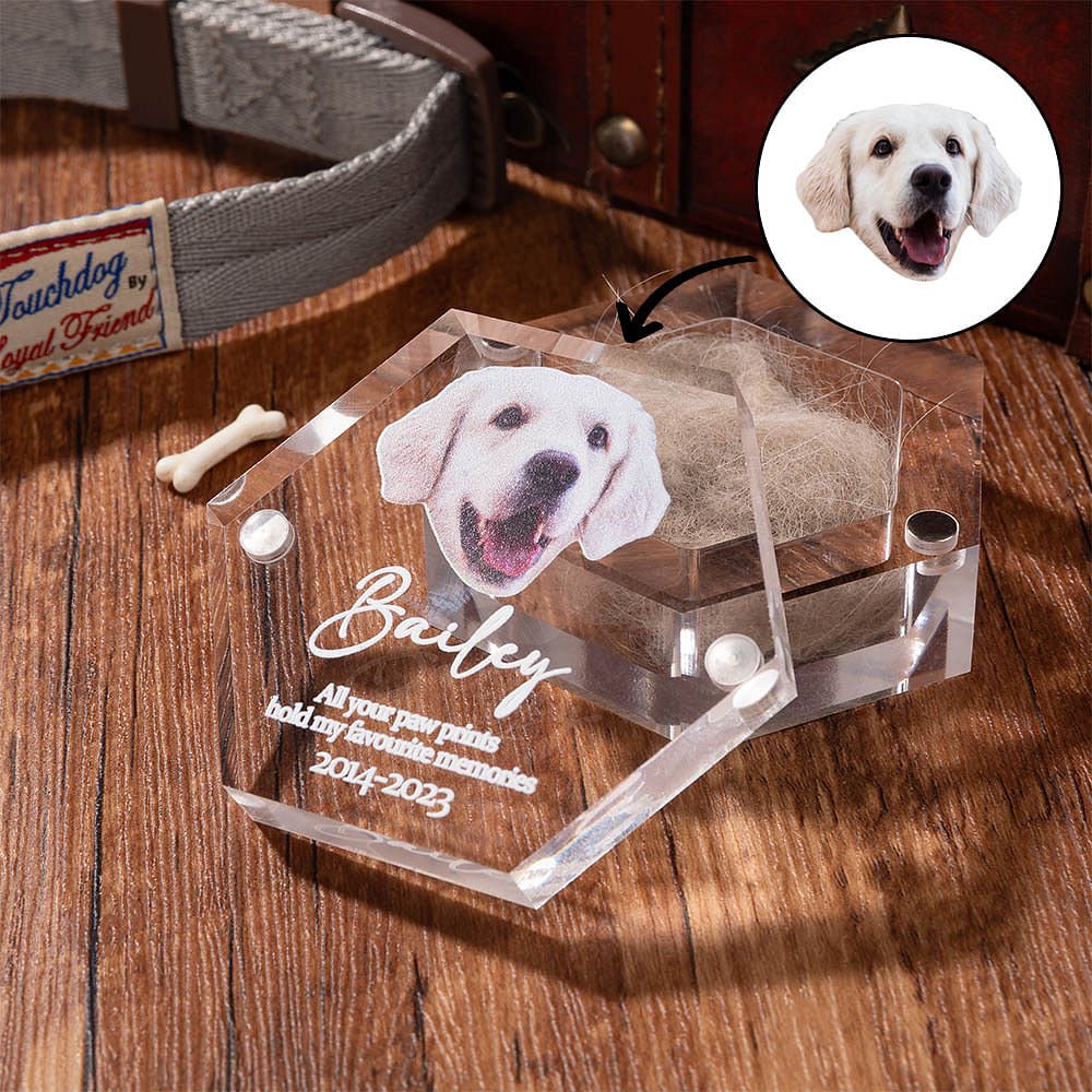 Questa scatola commemorativa personalizzata è un modo bellissimo per onorare la memoria del vostro amato animale domestico. Offre un posto speciale per tenere vicino un pezzo della loro pelliccia, offrendo conforto e un tributo duraturo nei momenti di dolore.