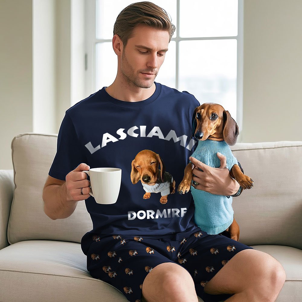 Questo pigiama, composto da maglietta e pantaloncini, permette di personalizzare separatamente ogni capo con la foto del tuo animale domestico, per sentirne la compagnia in ogni momento della giornata. La maglietta include anche la possibilità di aggiungere un testo personalizzato accanto alla scritta fissa DORMIRE, creando un’atmosfera rilassante e personale che riflette il tuo affetto per il tuo amico a quattro zampe.