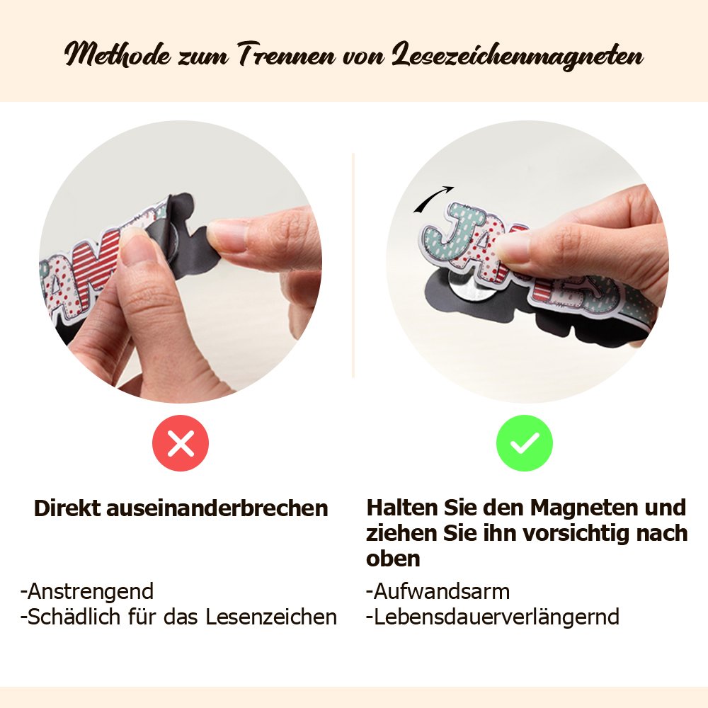 | Cura: | - Evitare di posizionare i segnalibri vicino a dispositivi elettronici, altoparlanti o altri magneti forti, poiché ciò potrebbe compromettere la chiusura magnetica. - Non lasciare i segnalibri alla luce diretta del sole o in ambienti caldi o freddi per periodi prolungati. - Pulire la superficie del segnalibro per rimuovere polvere o macchie. Non utilizzare acqua, prodotti chimici o detergenti abrasivi per non danneggiare i materiali. - Poiché i segnalibri hanno una forte forza magnetica, per una durata ottimale consigliamo di aprirli e chiuderli facendo scorrere i due lati piuttosto che tirarli direttamente. - Fare attenzione quando si attaccano o si staccano i segnalibri dalle pagine del libro. Evitare di tirare o torcere con forza il segnalibro, che potrebbe danneggiare il meccanismo di apertura e chiusura. |