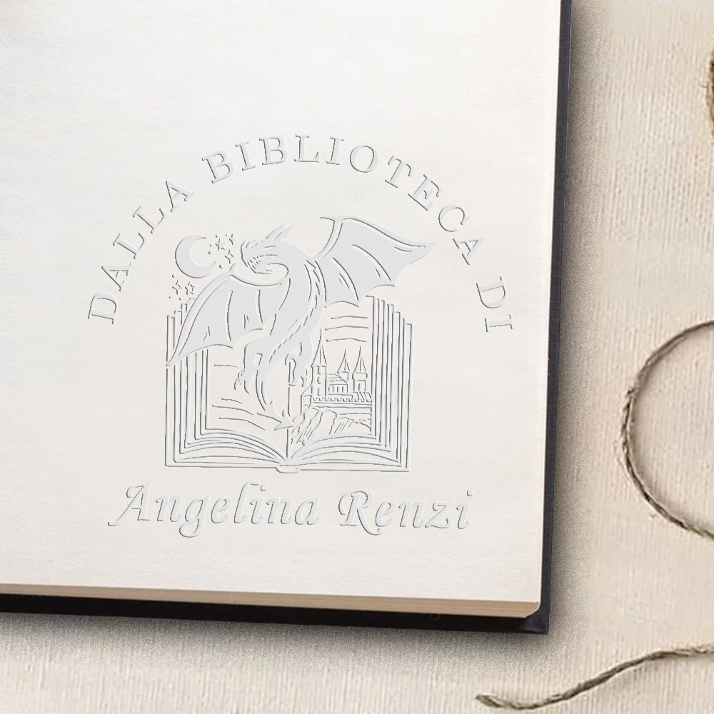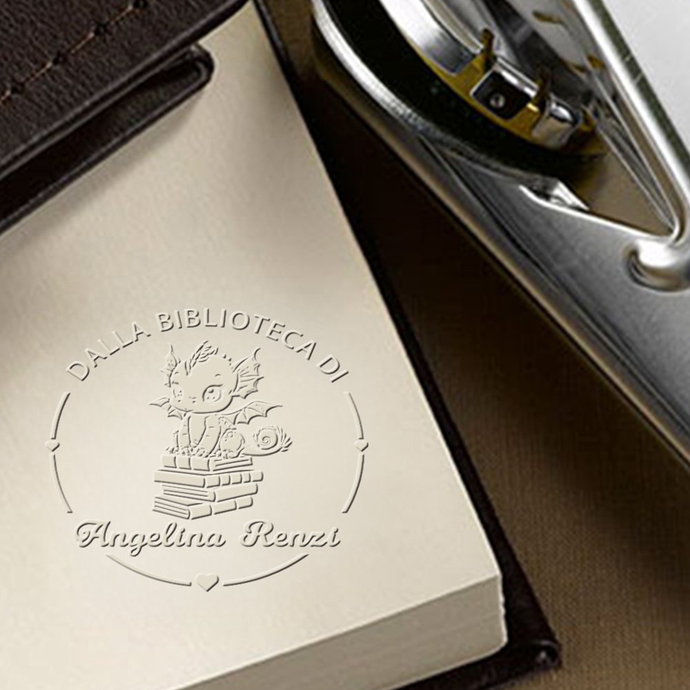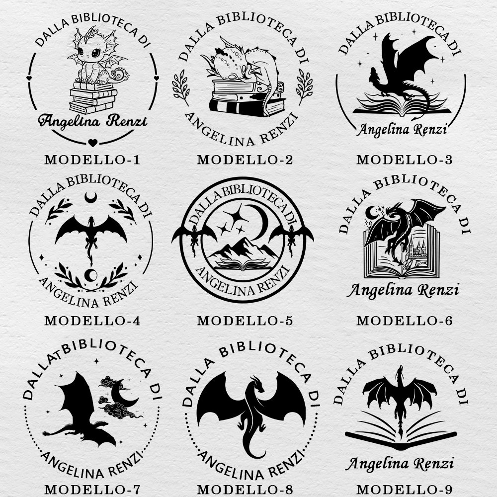 Questo timbro per libri presenta 9 diverse varianti di design a tema drago, circondate dalla classica frase "Dalla Biblioteca di", personalizzabile con il nome dell'amante dei libri. Un'aggiunta incantevole alla collezione di ogni bibliofilo, in particolare per chi è affascinato dalle creature mitologiche e dal fascino senza tempo dei draghi.