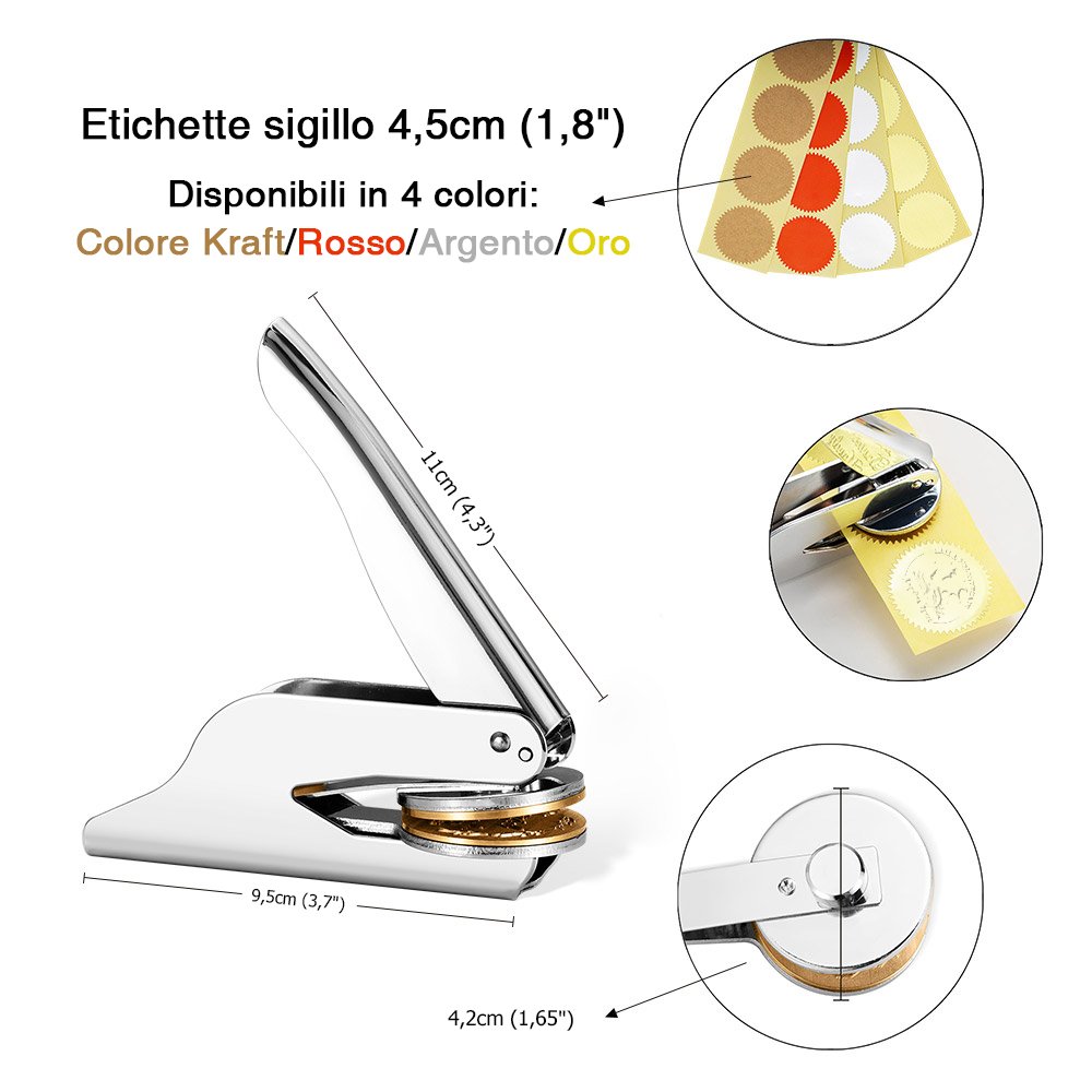 | Dimensione: | Base in ottone circolare: diametro 4,2 cm (1,65") Timbro a secco: 11 cm × 9,5 cm (4,33" × 3,74") |