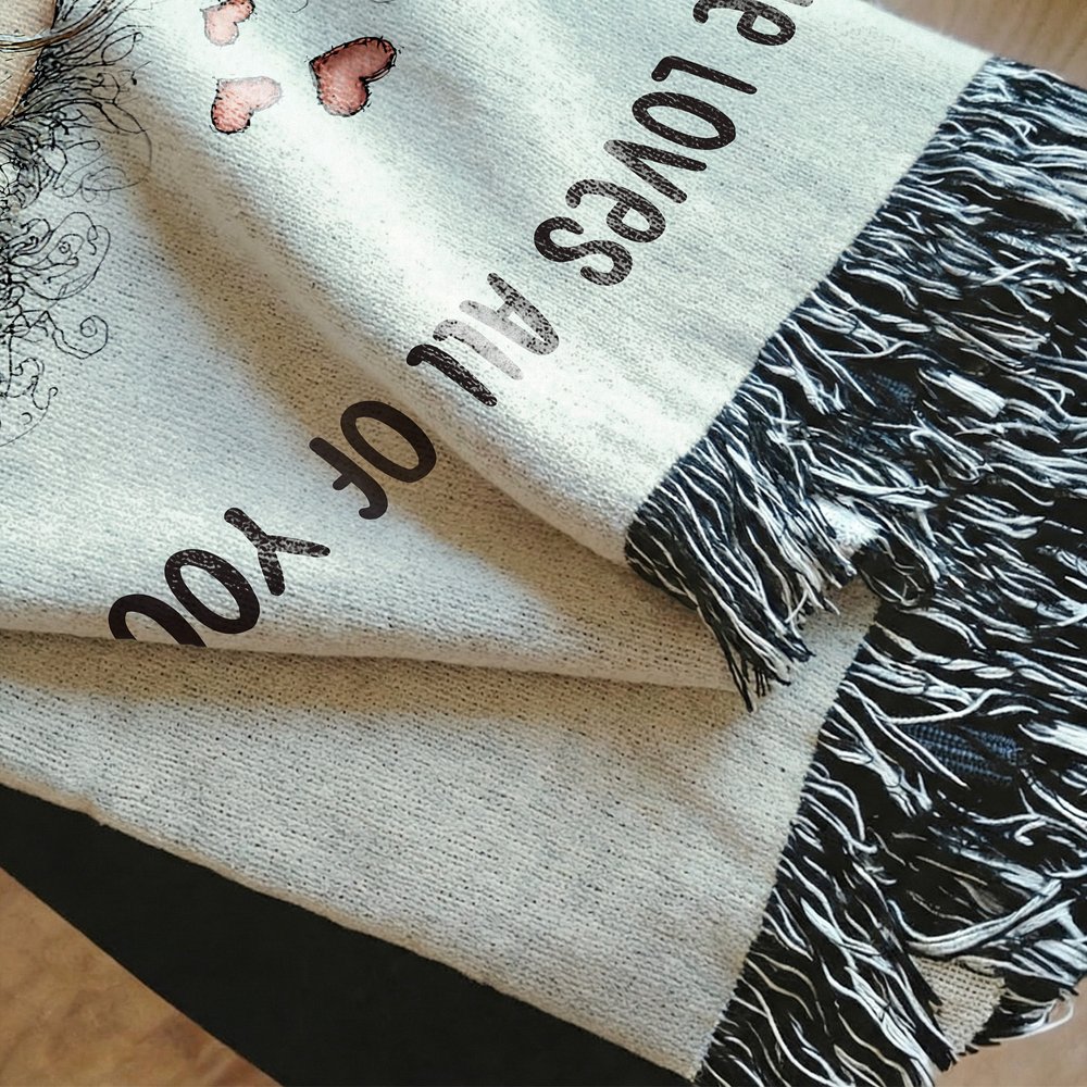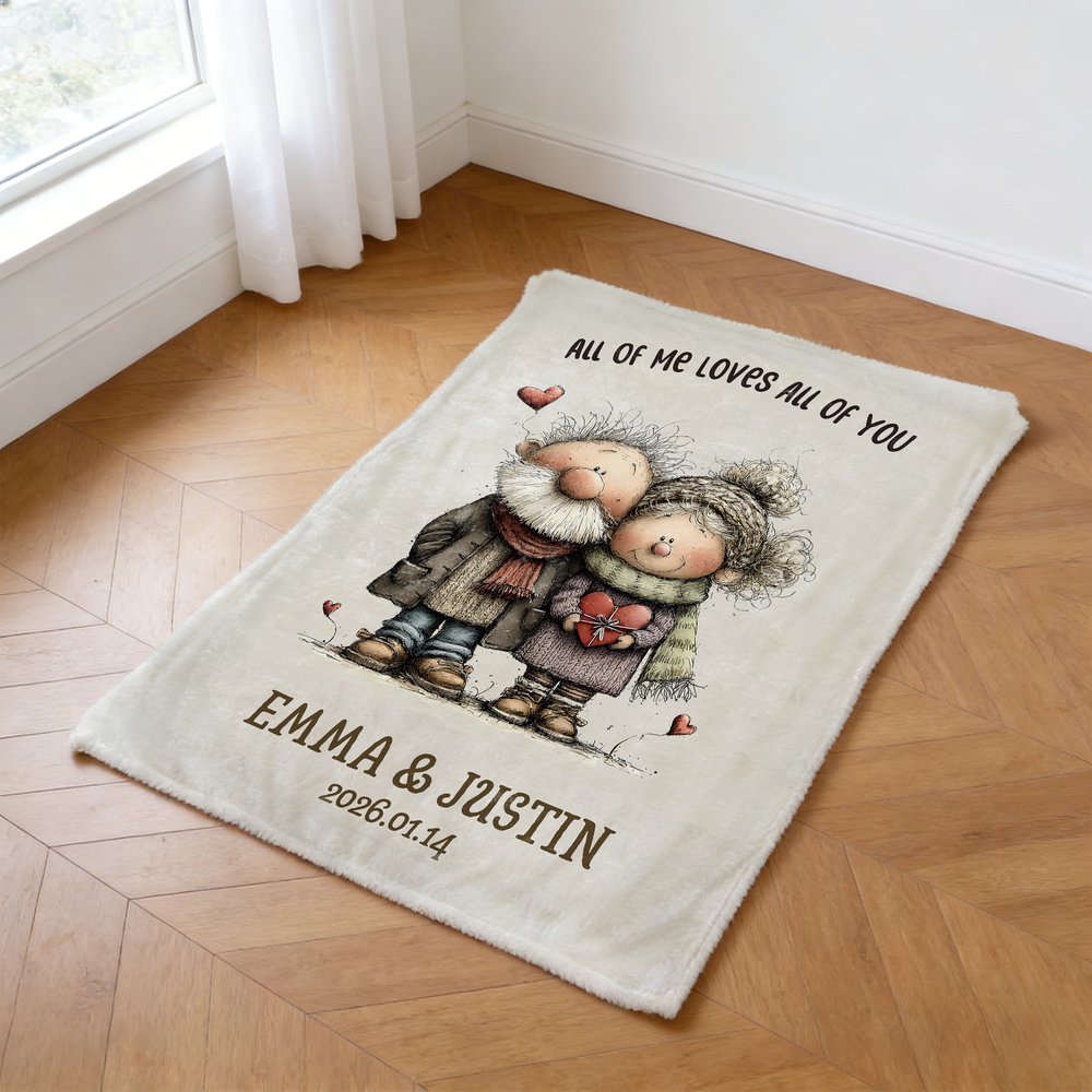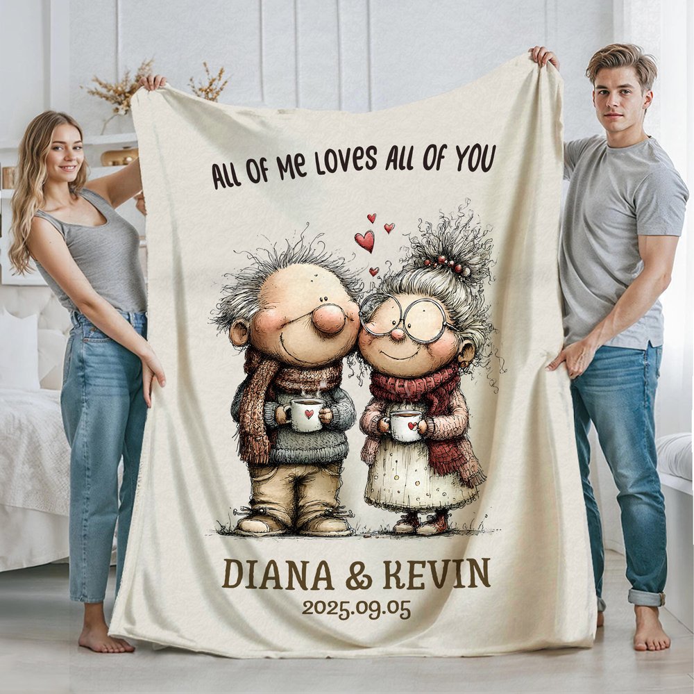Questa coperta che scalda il cuore presenta un bellissimo disegno che raffigura un'affascinante coppia di anziani, accompagnato dal testo romantico personalizzato, ecc. "All of me loves all of you" e da motivi a cuore. Può essere completamente personalizzata: aggiungete i vostri nomi e una data speciale sul fondo della coperta per creare un ricordo unico che celebra l'amore eterno e i ricordi più cari. Questo design stravagante ma profondamente sentimentale fonde perfettamente la carineria con l'emozione genuina, rendendolo un meraviglioso tributo all'amore duraturo.