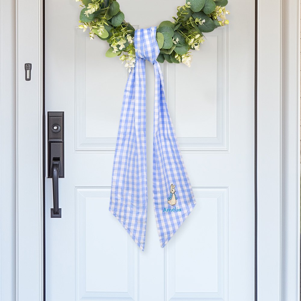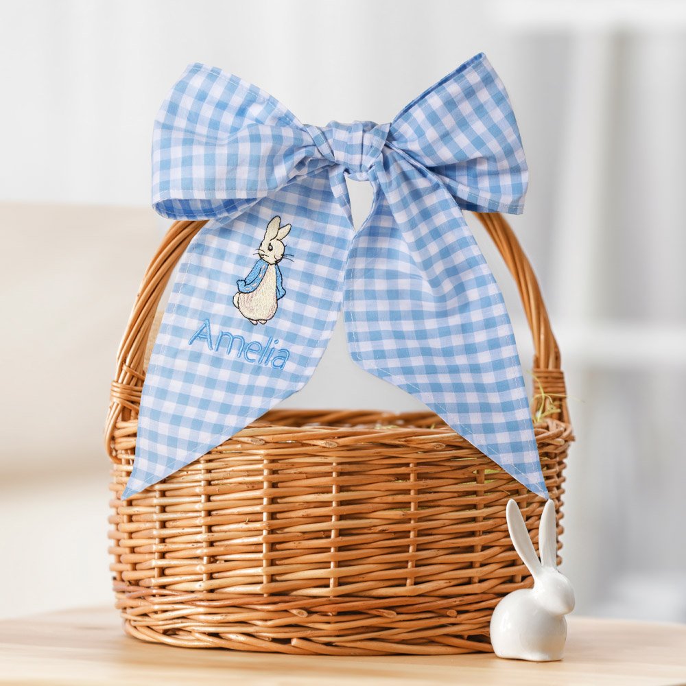 Ciò che distingue questa fascia è la possibilità di personalizzarla con il nome del bambino e il simpatico motivo del coniglietto, ricamandolo. Il motivo gingham aggiunge un tocco di festa, rendendola l'accessorio perfetto per i cesti pasquali, le docce per bambini o le celebrazioni del battesimo. È possibile scegliere tra sei colori di fascia per creare un regalo unico.