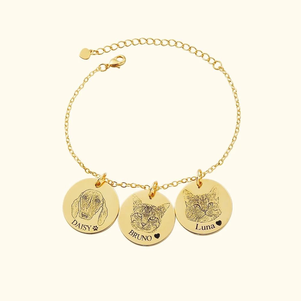 Personalizza il tuo braccialetto con da 1 a 5 ciondoli a disco, ognuno inciso con il ritratto, il nome e l’icona del tuo amato animale domestico. Un accessorio unico che celebra il legame con i tuoi compagni a quattro zampe, perfetto sia se hai un solo fedele amico sia se condividi la vita con un piccolo branco.