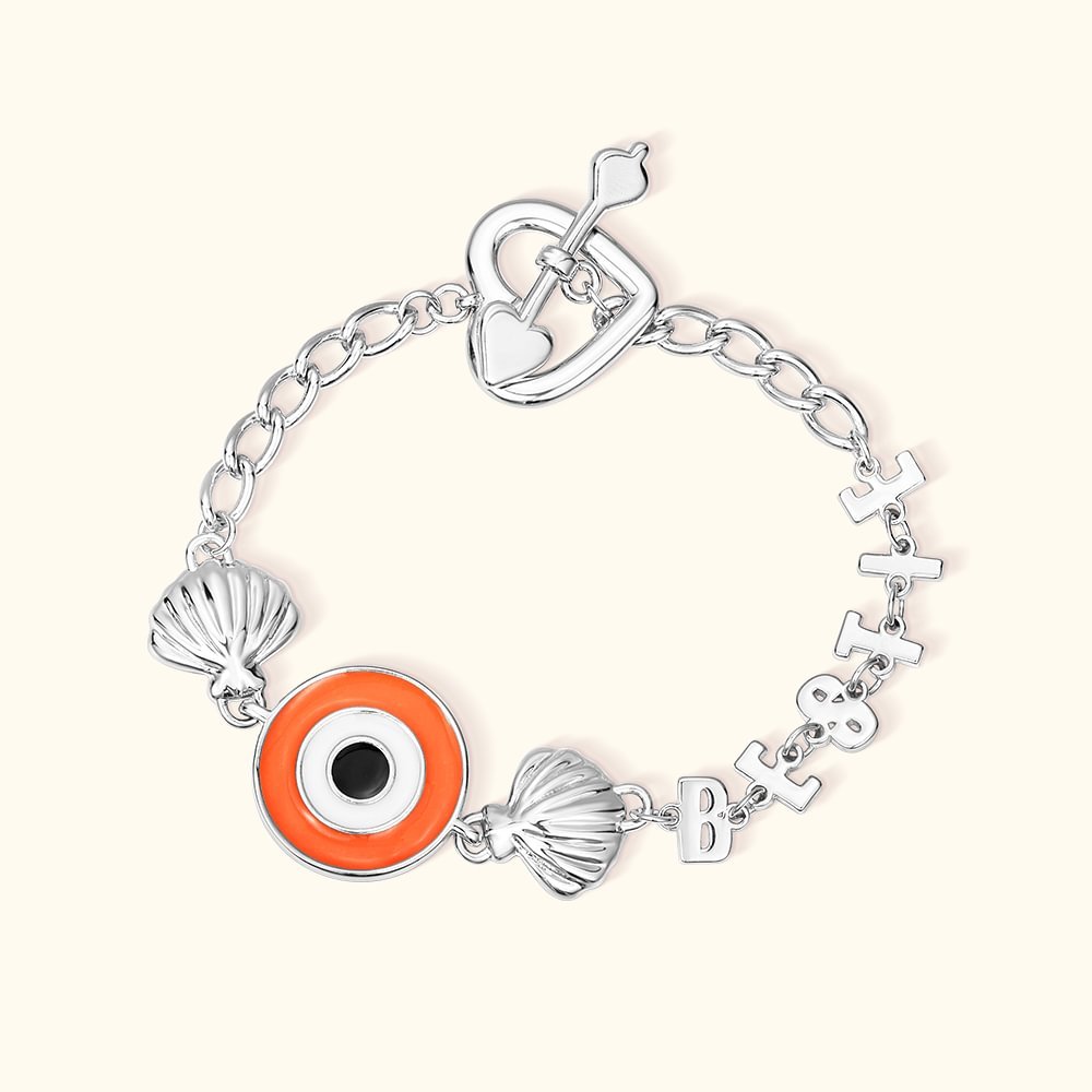 Questo braccialetto utilizza il malocchio come titolo principale del design. I suoi diversi colori contengono diversi significati protettivi. La conchiglia sul lato simboleggia l'unione dell'amicizia di due persone. Si inserisce in modo stretto e continuo, proteggendo la loro amicizia da eventuali violazioni. Una parte del design combina gli elementi dell'amore e delle frecce, che racchiudono un forte legame e una comprensione reciproca ed è anche uno degli elementi più popolari oggi. Il design di questo bracciale è semplice ed elegante. I suoi elementi alla moda lo rendono un pezzo senza tempo.