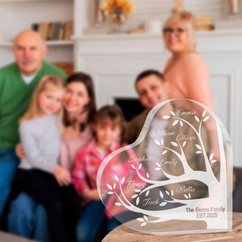 La nostra targa in acrilico presenta un bellissimo design ad albero genealogico che può essere personalizzato con 1 o 18 nomi di bambini e 2 testi speciali. È una rappresentazione perfetta del legame e dell'amore condiviso all'interno di una famiglia.