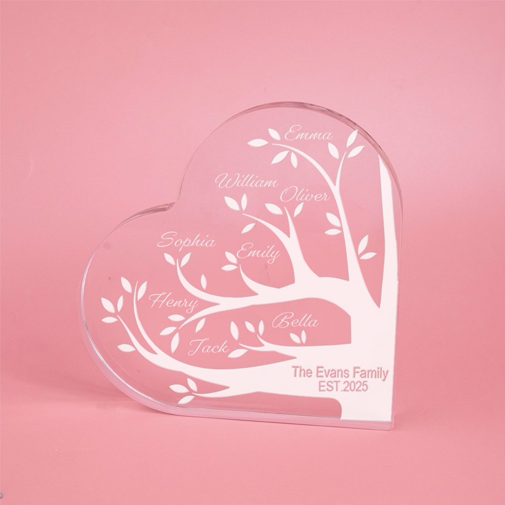 La targa in acrilico dell'albero genealogico è una decorazione commemorativa per la casa, che simboleggia l'importanza della famiglia e l'interconnessione tra le generazioni. Può essere esposta con orgoglio in salotto, in camera da letto, in un armadio o su uno scaffale. È un promemoria costante dell'amore, dell'unità e dei ricordi condivisi in famiglia.
