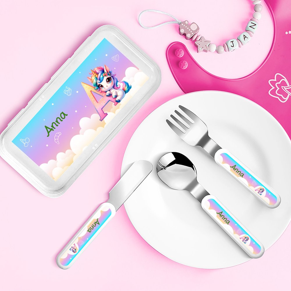 Con un tenero unicorno in stile cartone animato come protagonista, puoi scegliere tra 26 iniziali personalizzate e 6 colori di sfondo. Inoltre, è possibile aggiungere il nome del bambino con 2 caratteri e 8 colori diversi. Che si tratti di un unicorno vivace o di combinazioni dai toni da sogno, queste posate diventano un vero “compagno di tavola” che accompagna i bambini nei loro pasti.