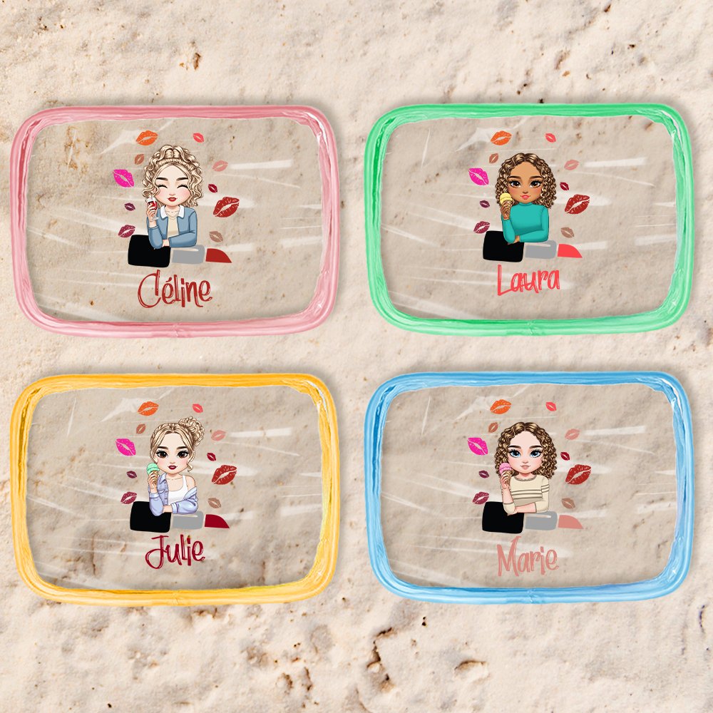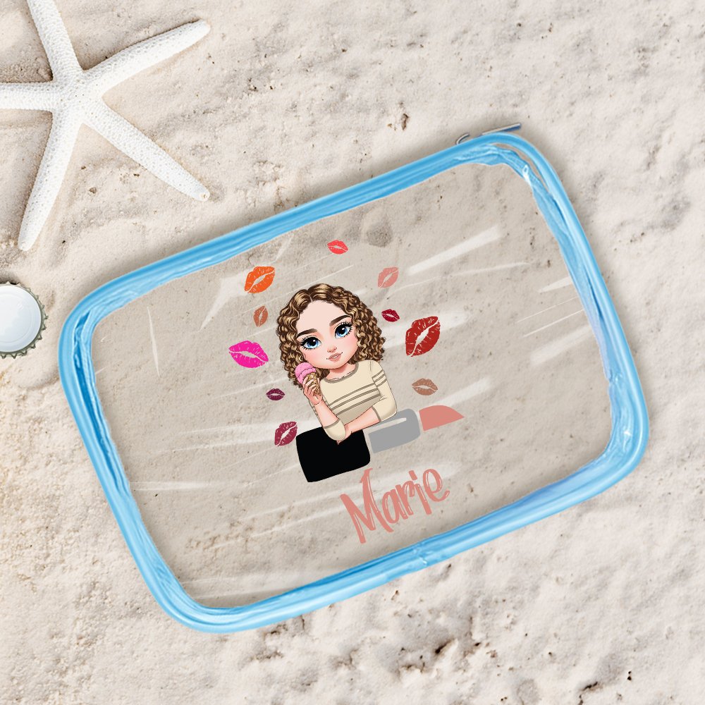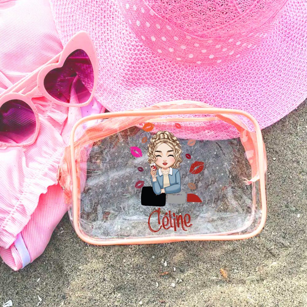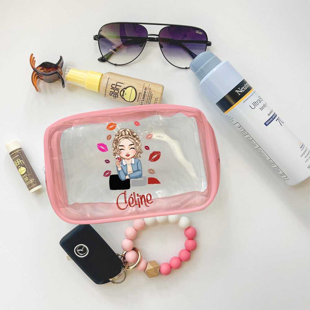 La combinazione tra l'immagine di una ragazza alla moda e il classico motivo del rossetto mostra l'eleganza e la sicurezza delle donne, aggiungendo un tocco di giocosità e vitalità. Questa trousse trasparente può essere personalizzata con l'immagine di una ragazza con rossetto e il suo nome per creare una trousse unica nel suo genere.