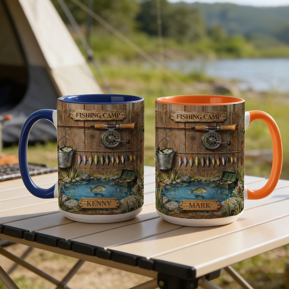 Questa tazza in ceramica si ispira al tema della pesca, catturando la tranquillità e la gioia di trascorrere una giornata in riva al mare. La parte anteriore della tazza presenta un logo rustico "FISHING CAMP", accompagnato da motivi giocosi di pesca come vari pesci, canne da pesca, secchi o scene serene di laghetti, mescolando abilmente un'estetica outdoor robusta con un fascino caldo e invitante. La personalizzazione con il vostro nome aggiunge un tocco personale.
