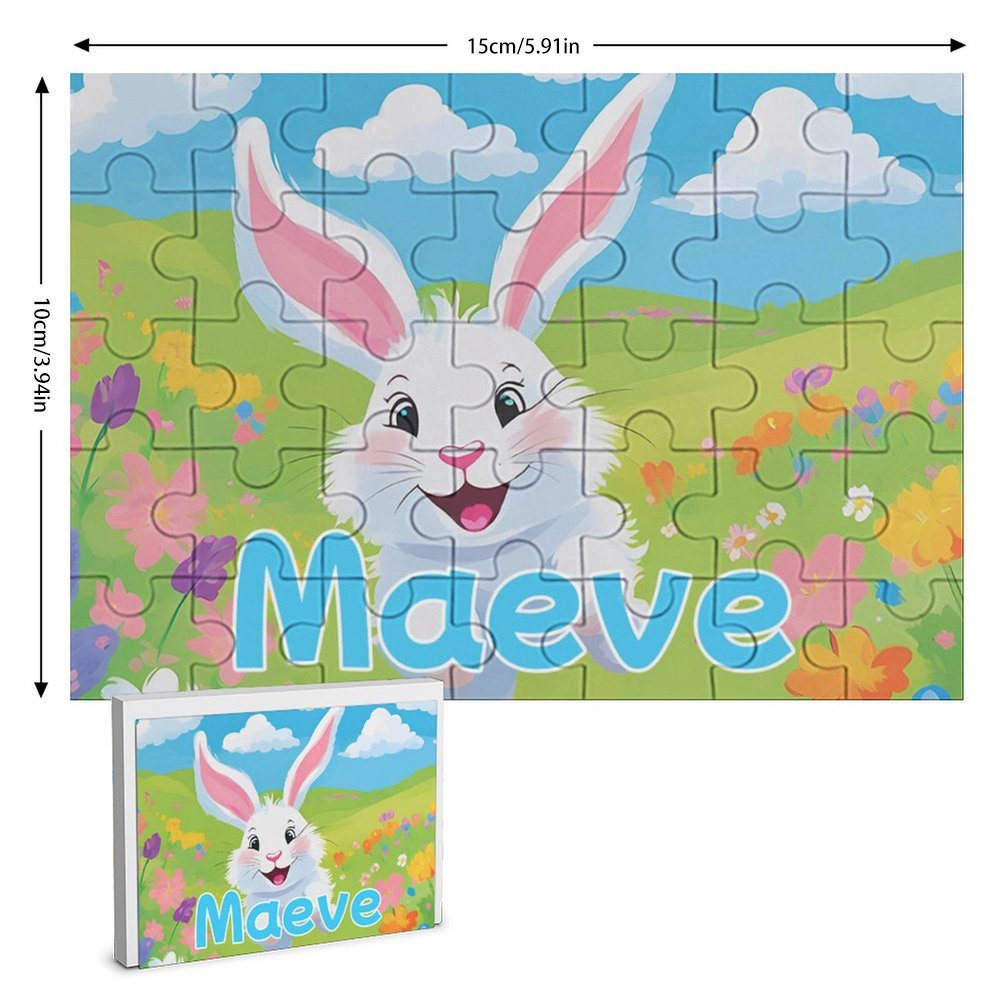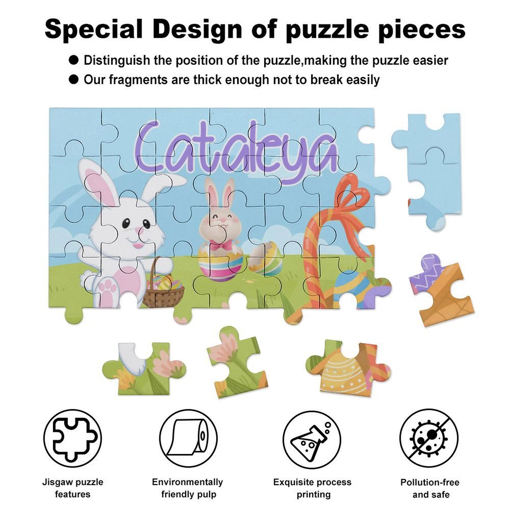Questo puzzle ha come tema un simpatico coniglietto pasquale, mentre le uova di Pasqua colorate e gli splendidi fiori che lo circondano aggiungono un'atmosfera festosa all'intera immagine. Inoltre, il nome del bambino può essere personalizzato sul puzzle, aumentando così il senso di appartenenza e l'esperienza personalizzata del bambino.