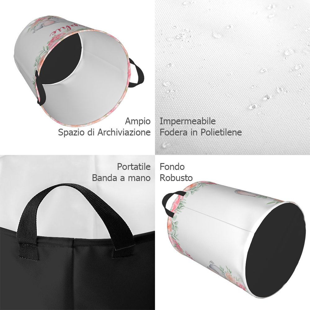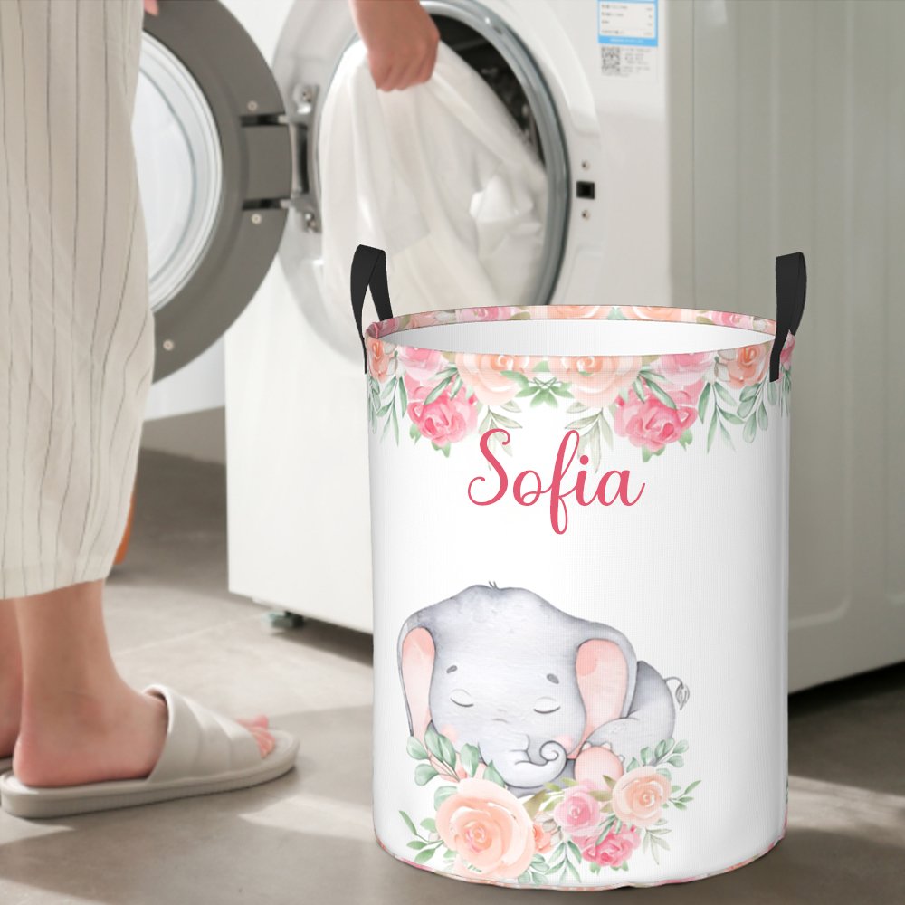 Questo cesto portabiancheria presenta un design colorato di fiori e un carino elefante che mette in mostra il nome del bambino in modo creativo. I colori vivaci e i motivi divertenti lo rendono un'aggiunta accattivante a qualsiasi stanza. La personalizzazione aggiunge un tocco speciale, trasformando una semplice soluzione di archiviazione in un caro ricordo.
