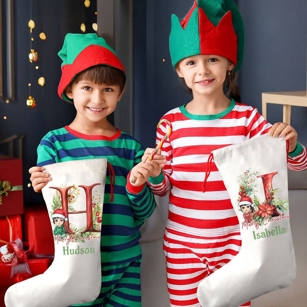 L'aspetto di questo sacchetto regalo imita la tradizionale forma della calza di Natale, stampata con un simpatico personaggio dei cartoni animati natalizi, circondato da un fiore e da una lettera, che rende speciale ogni sacchetto regalo, mentre il testo "Merry Christmas" conferisce al sacchetto regalo un'atmosfera natalizia personalizzata.
