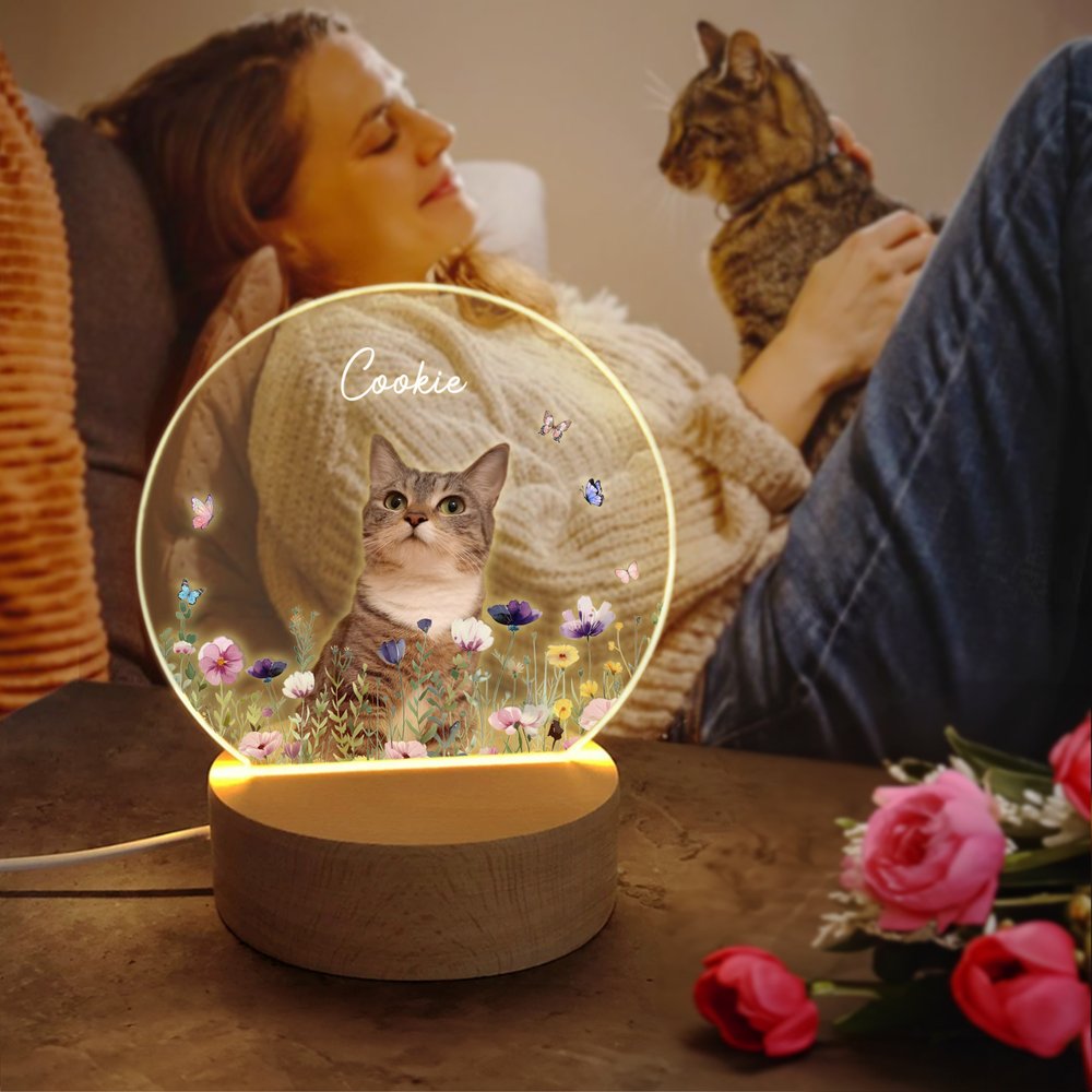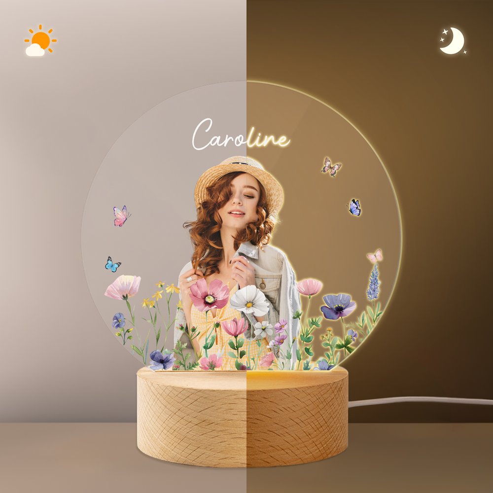 È possibile creare una luce notturna unica nel suo genere scegliendo tra quattro delicati motivi floreali acquerellati, caricando una foto nitida sulla parte anteriore e aggiungendo un nome personalizzato o un messaggio sentito. Il design fonde la vostra foto personale con vivaci fiori di campo e farfalle svolazzanti, trasformando una semplice luce in un tributo profondamente personale.