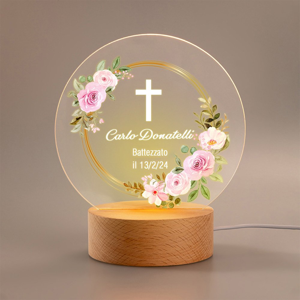 Questa luce notturna a LED è decorata con una croce finemente lavorata, avvolta da una delicata corona di fiori o foglie, simbolo di fede, amore e benedizione. Personalizzala con un nome, una data o un messaggio speciale per renderla davvero unica.