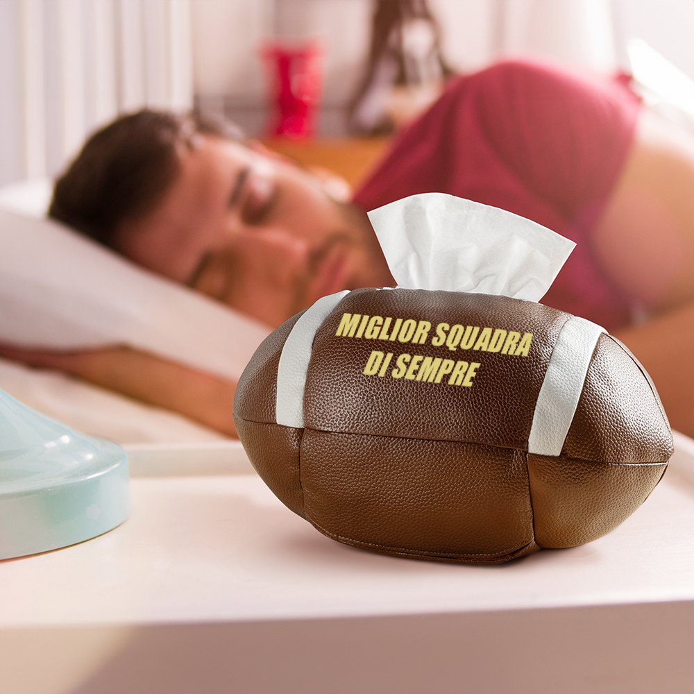 Questa custodia per scatola per fazzoletti (ma si usa anche direttamente come scatola per fazzoletti) si distingue per la sua creativa combinazione di funzione estetica sportiva e praticità. Caratterizzata da un'affascinante forma di football americano, ha uno scopo funzionale e migliora l'arredamento della casa. Può essere personalizzatq su entrambi i lati: da un lato è possibile stampare il logo o il nome della tua squadra preferita, mentre sull'altro si può visualizzare un'esortazione o un testo a piacere. Il suo design unico la rende un must per gli amanti dello sport.