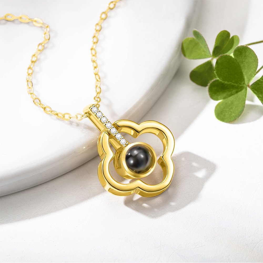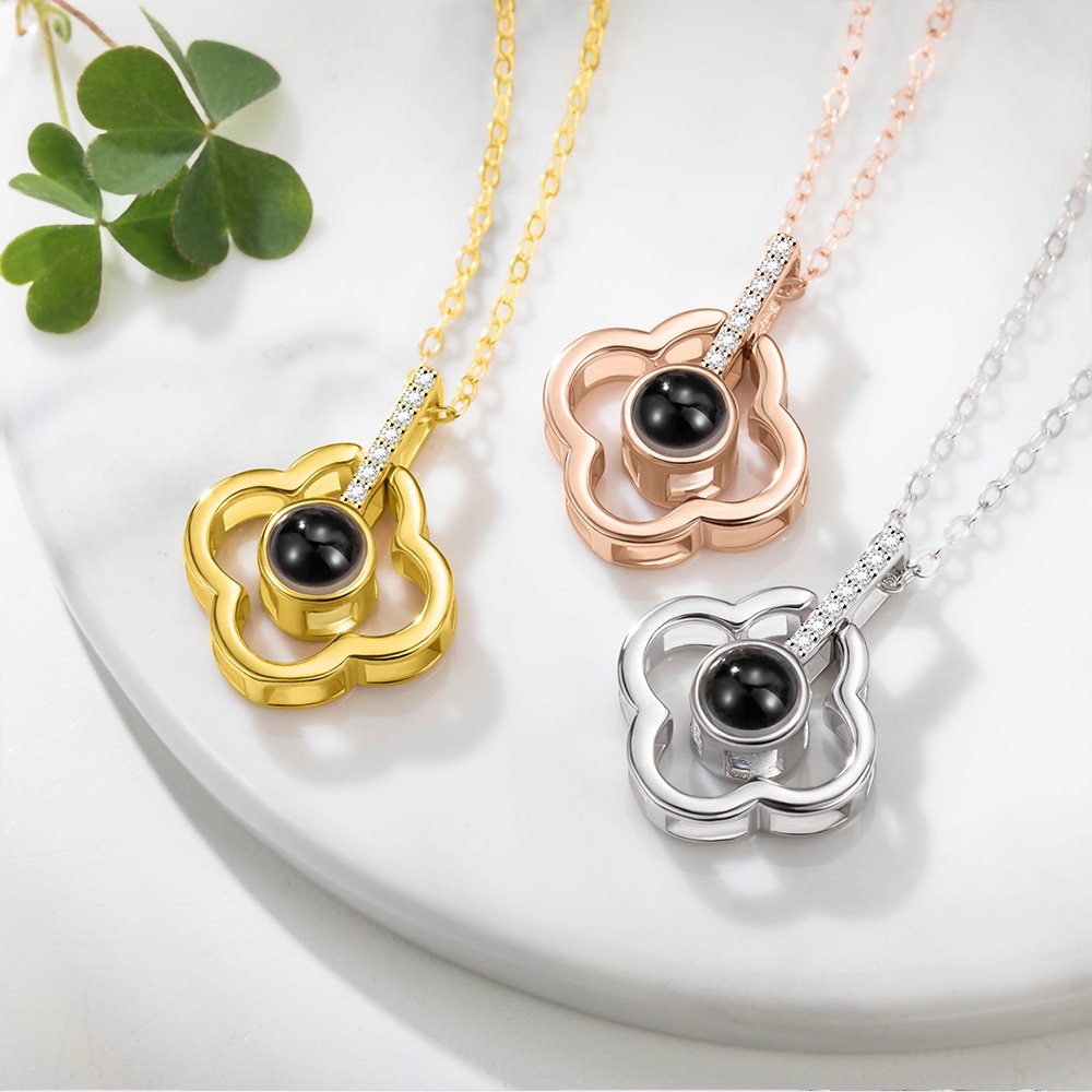 Collana personalizzata in argento sterling con proiezione di foto del quadrifoglio e 100 lingue per la festa della mamma e l'anniversario.