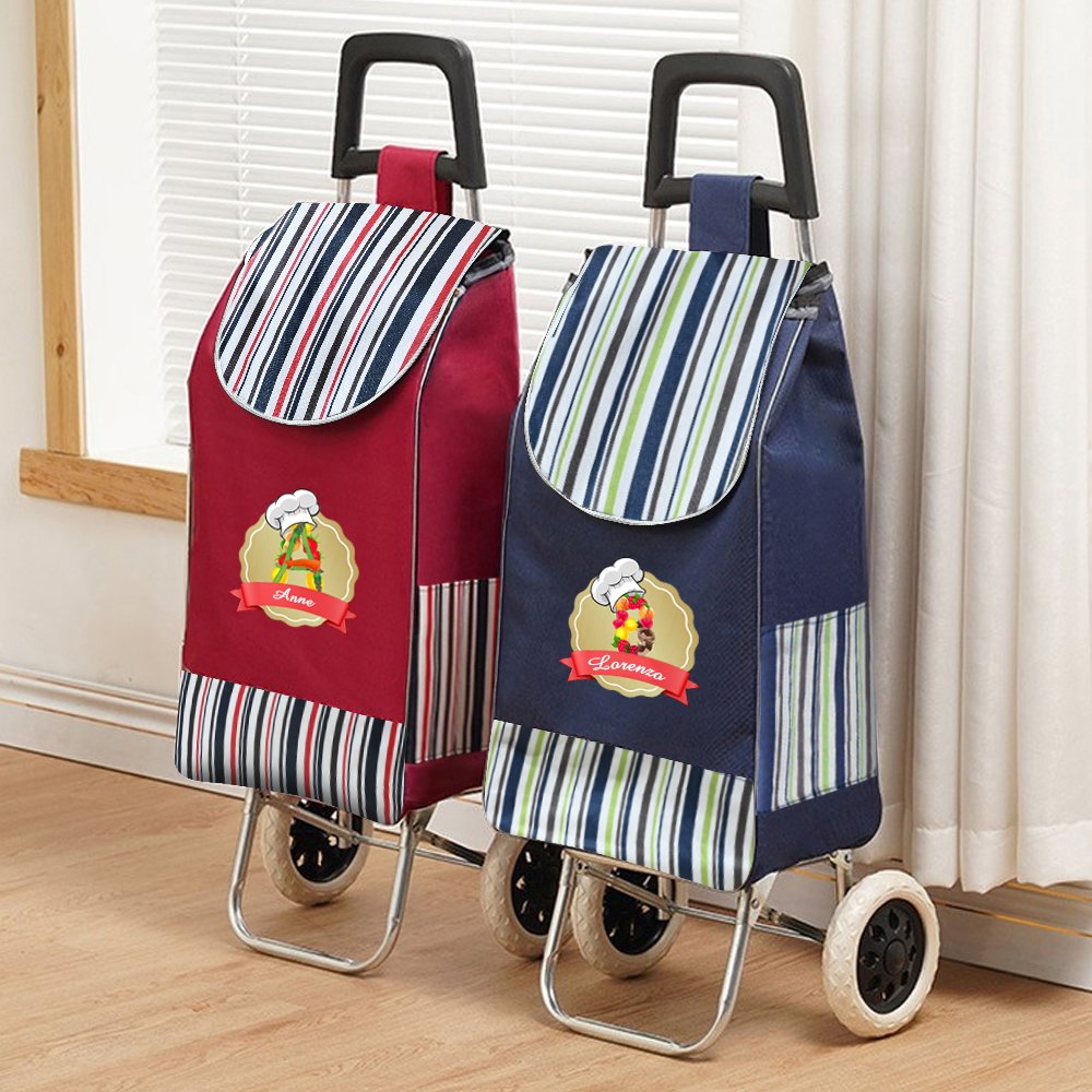 Questa borsa per la spesa presenta simpatici motivi con frutta e verdura che indossano cappelli da cuoco, accompagnati da monogrammi personalizzabili. È disponibile in cinque colori e può essere ricamata con il nome desiderato, permettendoti di riconoscerla facilmente tra tante altre nell’area di stoccaggio del supermercato.