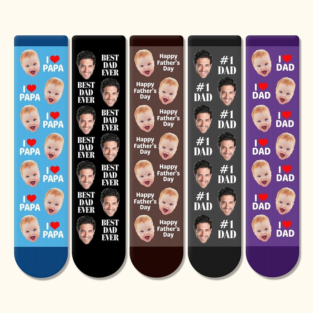 Siete alla ricerca di un regalo divertente per l'uomo speciale della vostra vita? I calzini stampati su misura sono regali fantastici e divertenti che il vostro papà preferito apprezzerà. Abbiamo nove colori e quattro stili di testo tra cui scegliere, basta caricare una foto del volto di un bambino, il nostro designer posizionerà il volto in un modello ripetuto, quindi non c'è bisogno di caricare più immagini.