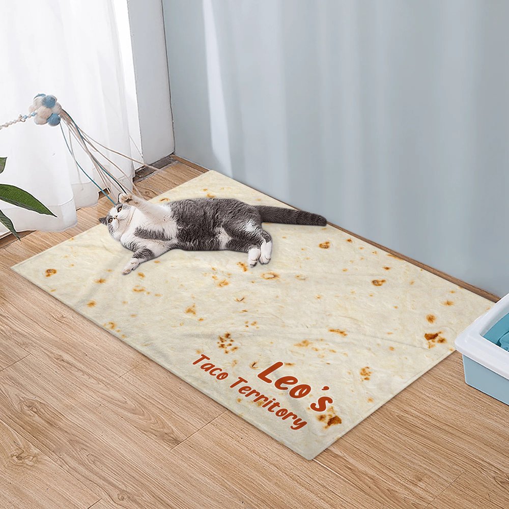La coperta nel suo complesso assume un aspetto simile a quello di una tortilla, con dettagli come i segni naturali della tostatura e i colori tenui. Il nome dell'animale e il testo personalizzato sono stampati in un angolo, con caratteri vivaci che riprendono il design "gourmet" della tortilla. Quando un animale domestico si sdraia su di esso, sembra essere "avvolto" in una deliziosa tortilla, e la scena è emozionante e carina.