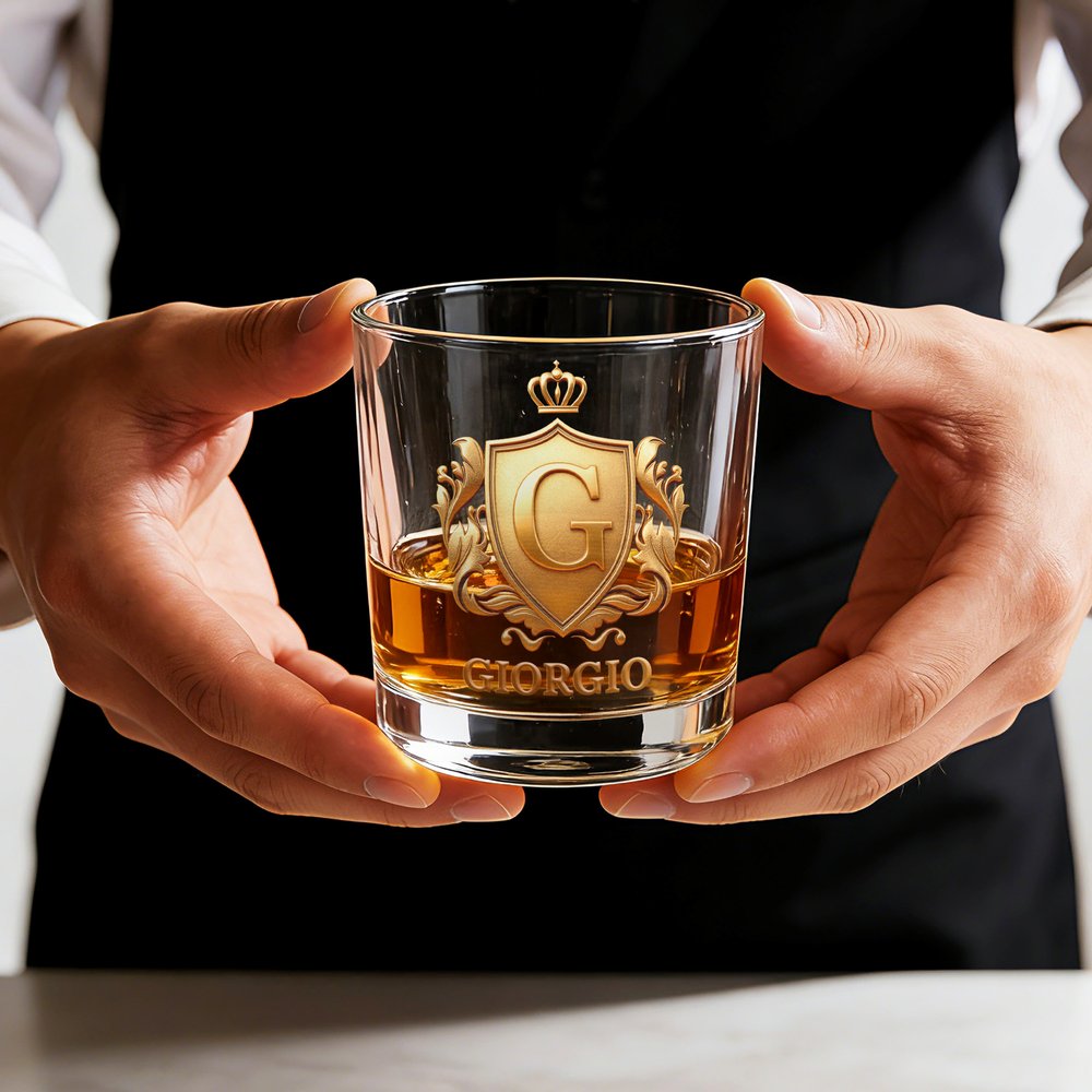 Questo bicchiere ha un distintivo dorato raffinato che puoi personalizzare con iniziali e nome. Trasparente e resistente, unisce eleganza vintage e personalizzazione, migliorando la tua esperienza di degustazione e diventando un pezzo da collezione per ogni appassionato di whisky. Non è solo un bicchiere, ma riflette la tua personalità e l’amore per i distillati di qualità.