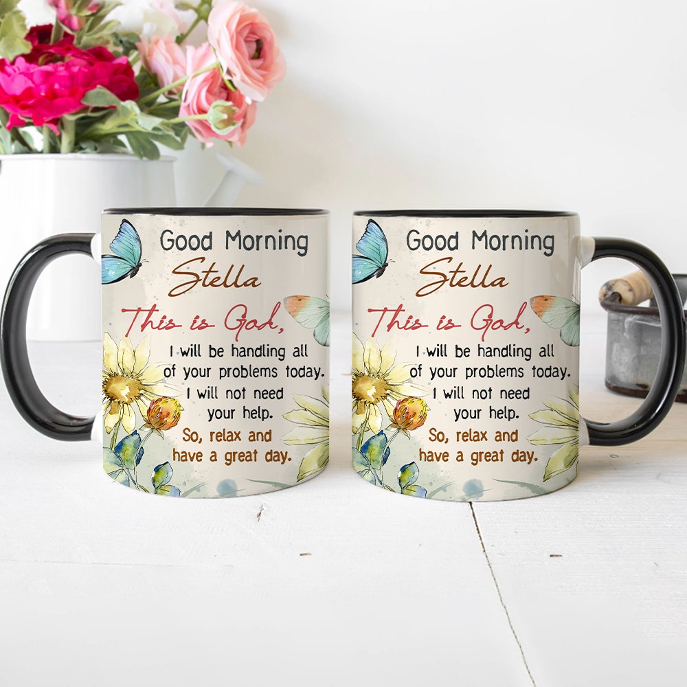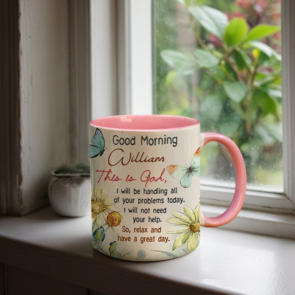 Questa tazza in ceramica da 11 once presenta un bellissimo disegno di farfalle e fiori, abbinato a un messaggio edificante: "Buongiorno, questo è Dio. Oggi mi occuperò di tutti i vostri problemi...". È un promemoria quotidiano di forza e resilienza per le donne, che incoraggia la positività. La parete interna e il manico della tazza sono disponibili in diverse opzioni di colore, creando un fascino unico.