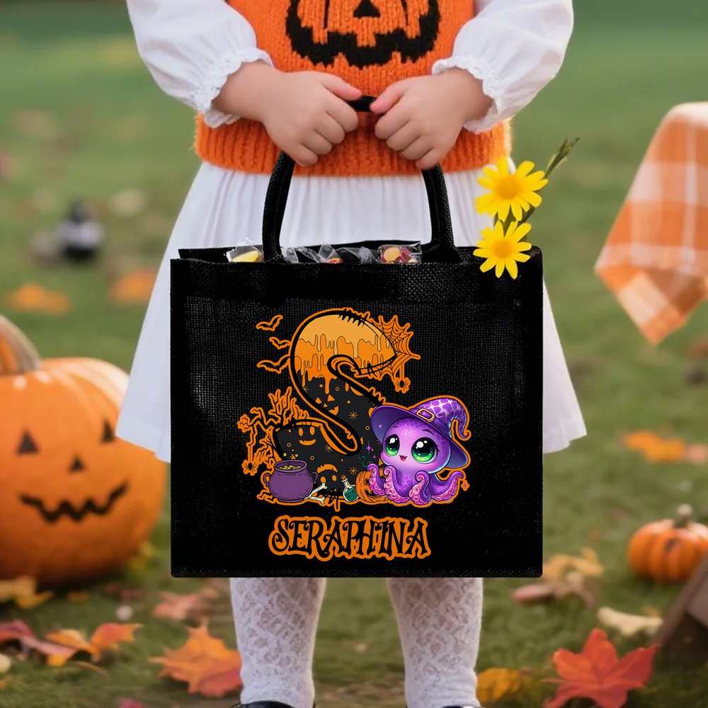 Personalizzato Halloween tema Carino animale grande capacità Tote Bag con iniziale e nome Halloween Dolcetto o scherzetto Regalo per la famiglia bambini