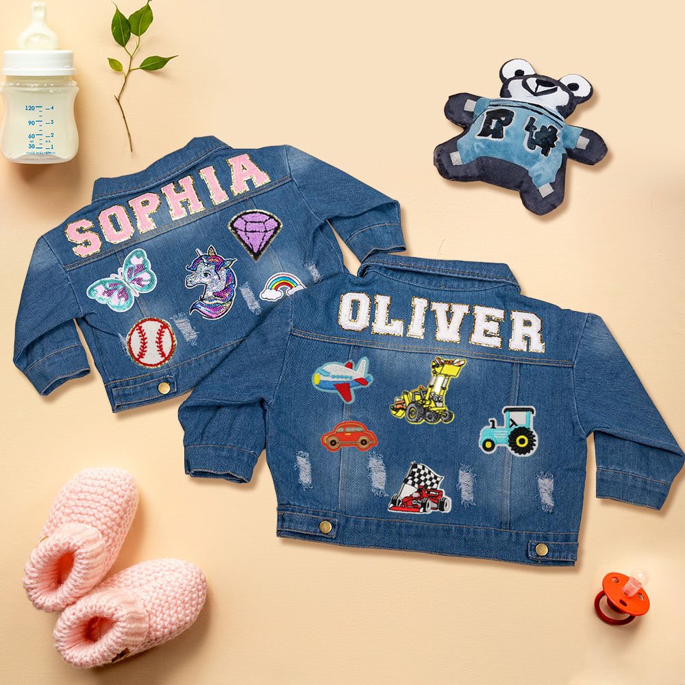 Scegliete tra 25 toppe decorative, tra cui farfalle, fiori, palloni da basket, stelle, arcobaleni, cuori, auto, escavatori e razzi. Selezionate da 1 a 7 toppe da posizionare sotto il nome del vostro bambino, per creare una giacca di jeans unica nel suo genere che metta in risalto la sua personalità e i suoi interessi.