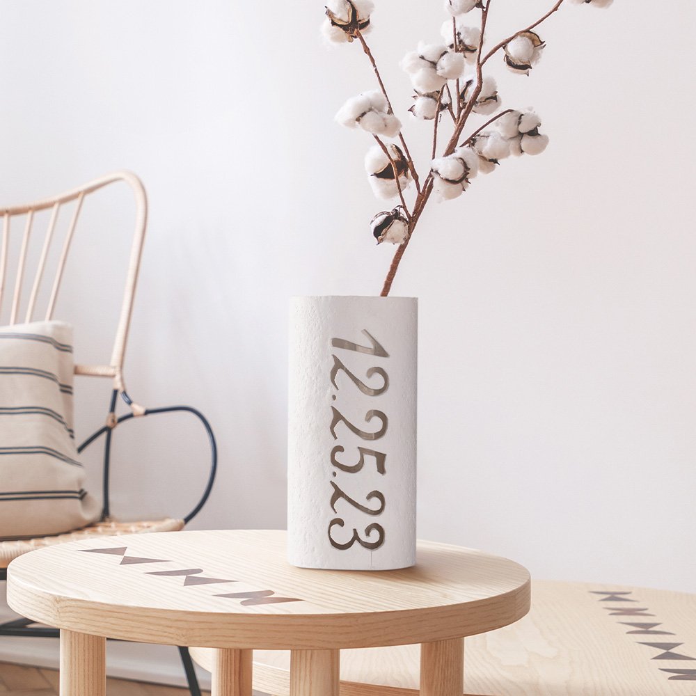 Il vaso può essere personalizzato con una data o un testo significativo, come il giorno del matrimonio o l'anniversario. Cattura ricordi preziosi e serve a ricordare costantemente la gioia e l'impegno che condividono.