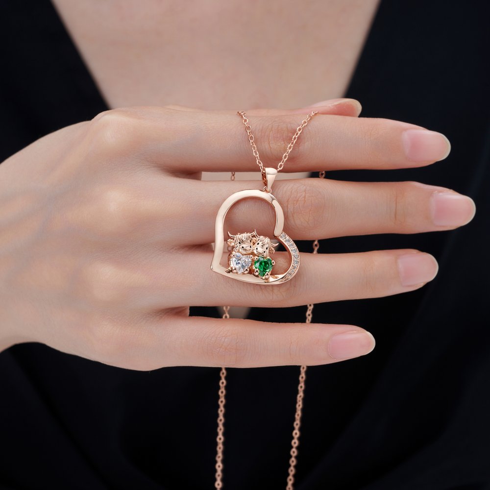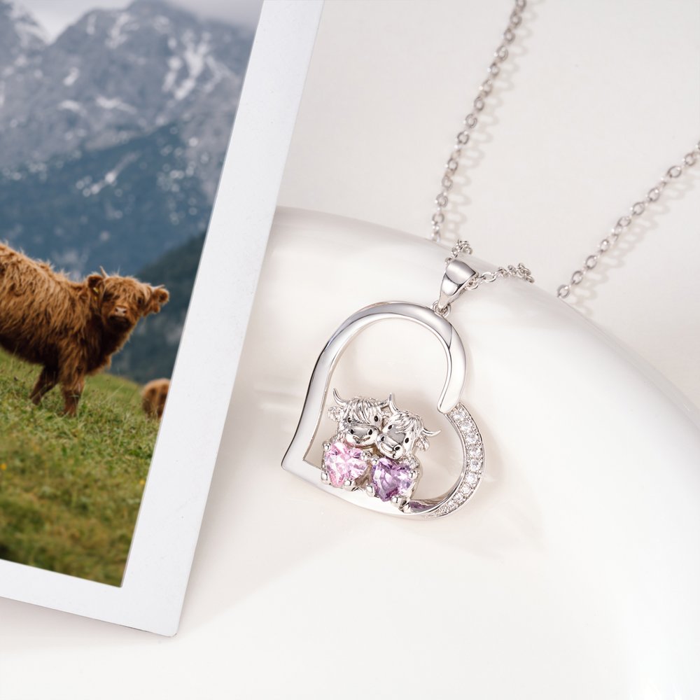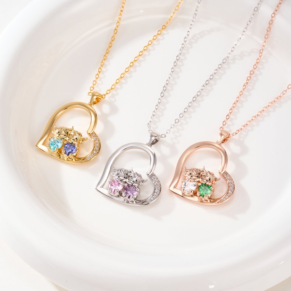 Cuore personalizzato 2 Highland Cows Birthstones Collana Dainty Gioielli Compleanno Anniversario Regalo per coppie Amici Highland Cow Lovers