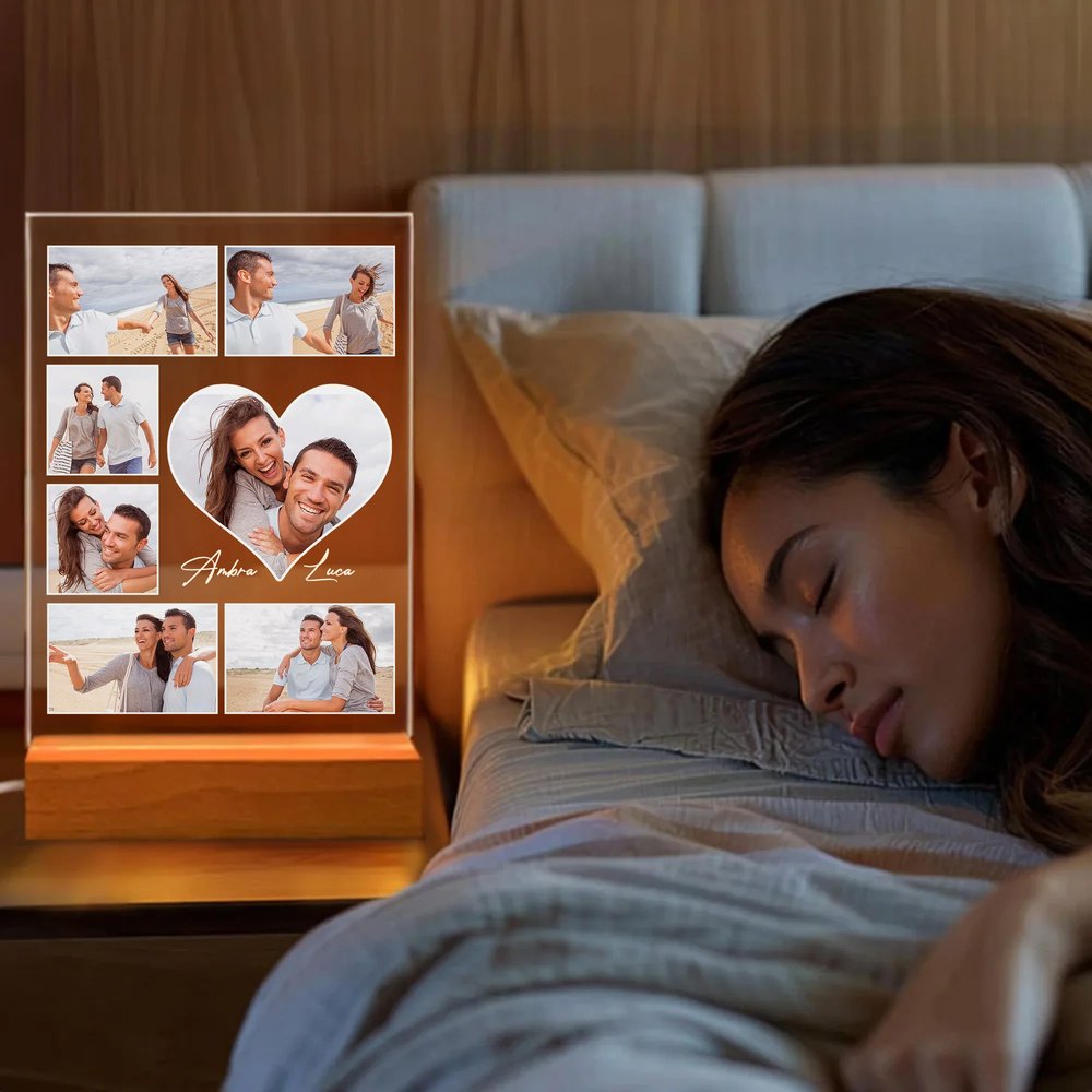 Questa luce notturna a cuore può essere personalizzata con 5-9 foto e i nomi della coppia, catturando momenti speciali per creare un ricordo unico ed emotivo. Il materiale acrilico trasparente e la luce soffusa la rendono un romantico simbolo d’amore.