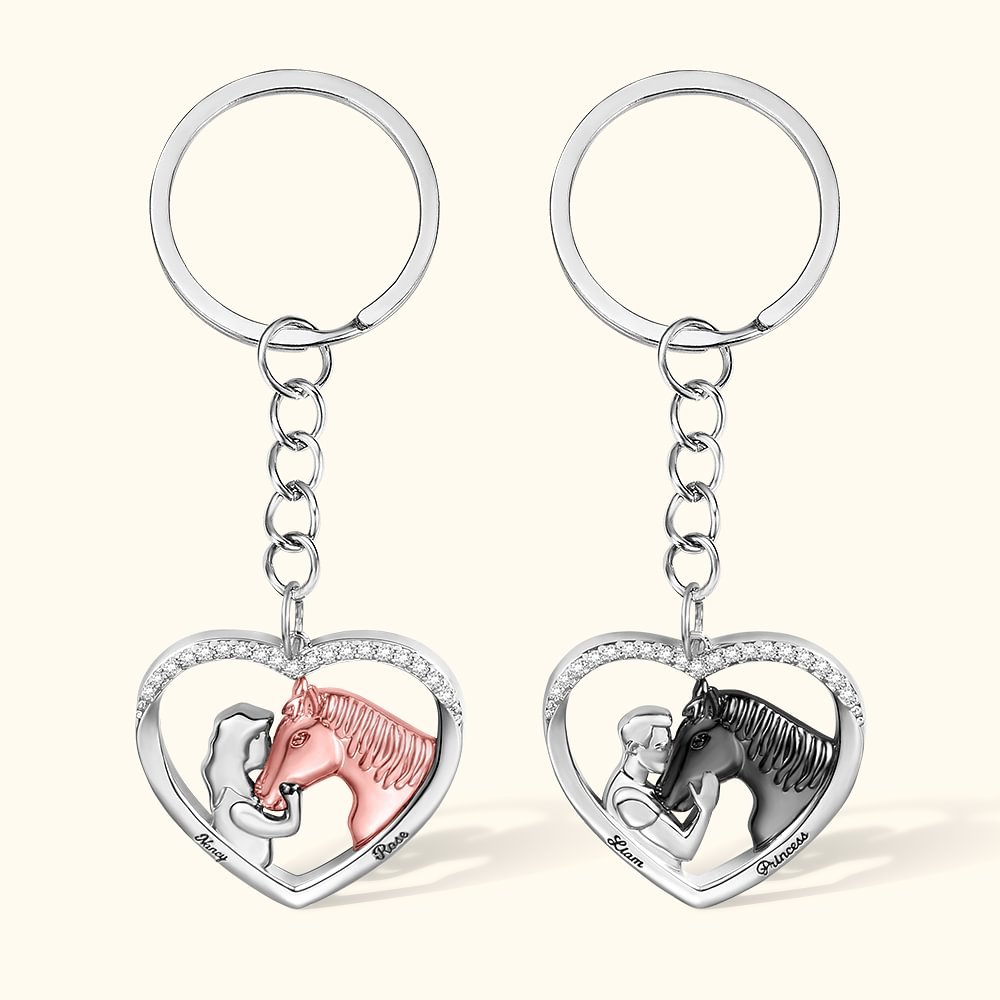 - I cavalli sono sempre stati considerati coraggiosi, liberi, audaci e appassionati. Simboleggiano lo spirito positivo della vita. Le persone credono che i cavalli portino fortuna. Una ragazza o un ragazzo accarezzano leggermente il loro cavallo preferito e sembrano parlare tra loro. Sono anche le persone che di solito condividono i loro segreti o le cose felici con i loro amici animali. L'utilizzo di questo portachiavi vi porterà ulteriore fortuna.