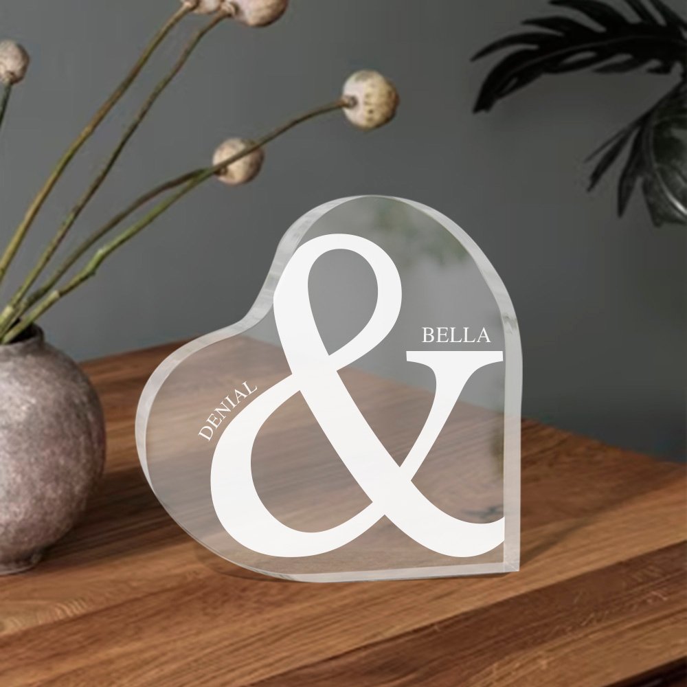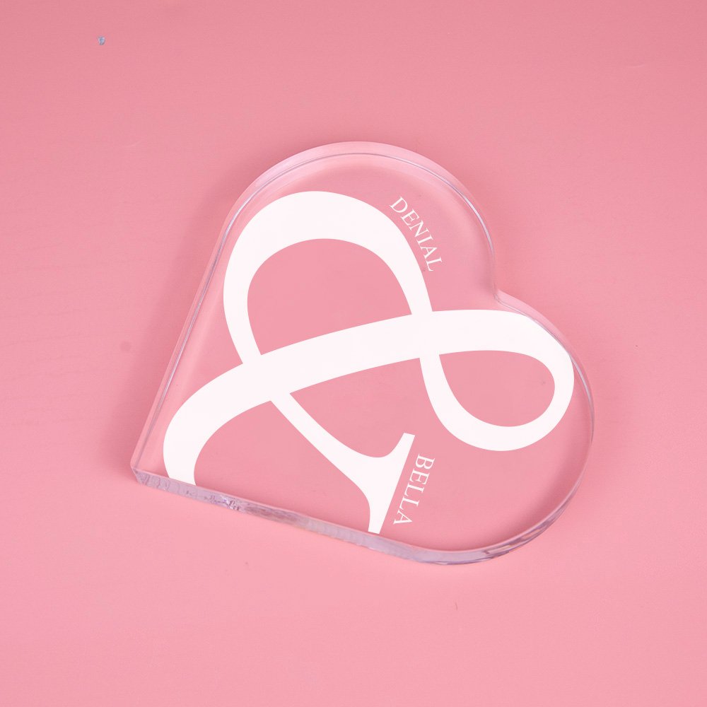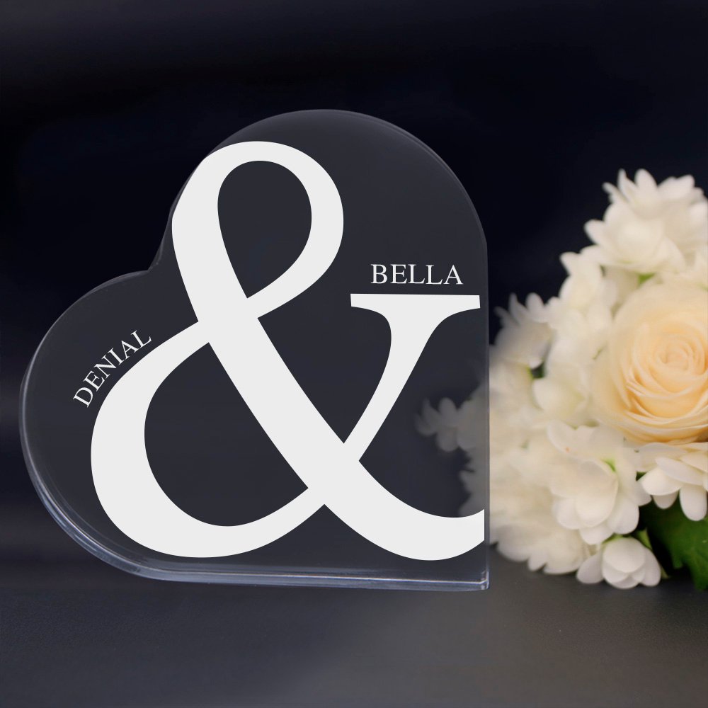 La targa a forma di cuore è realizzata in acrilico di alta qualità e può essere personalizzata con i nomi degli sposi. Il simbolo "&" aggiunge un tocco romantico, rendendola un ricordo significativo per i destinatari. Il design elegante e il materiale resistente rendono questa targa un pezzo senza tempo che può essere esposto e conservato per gli anni a venire.