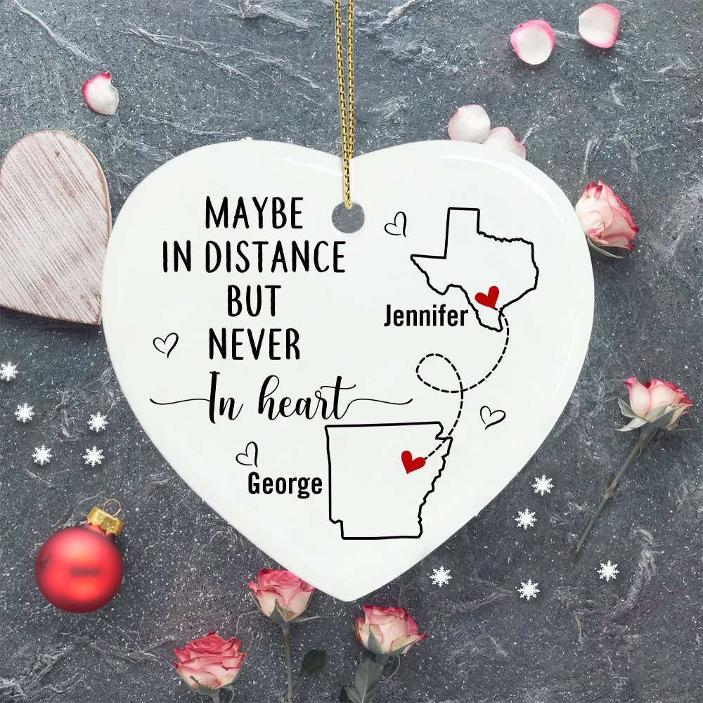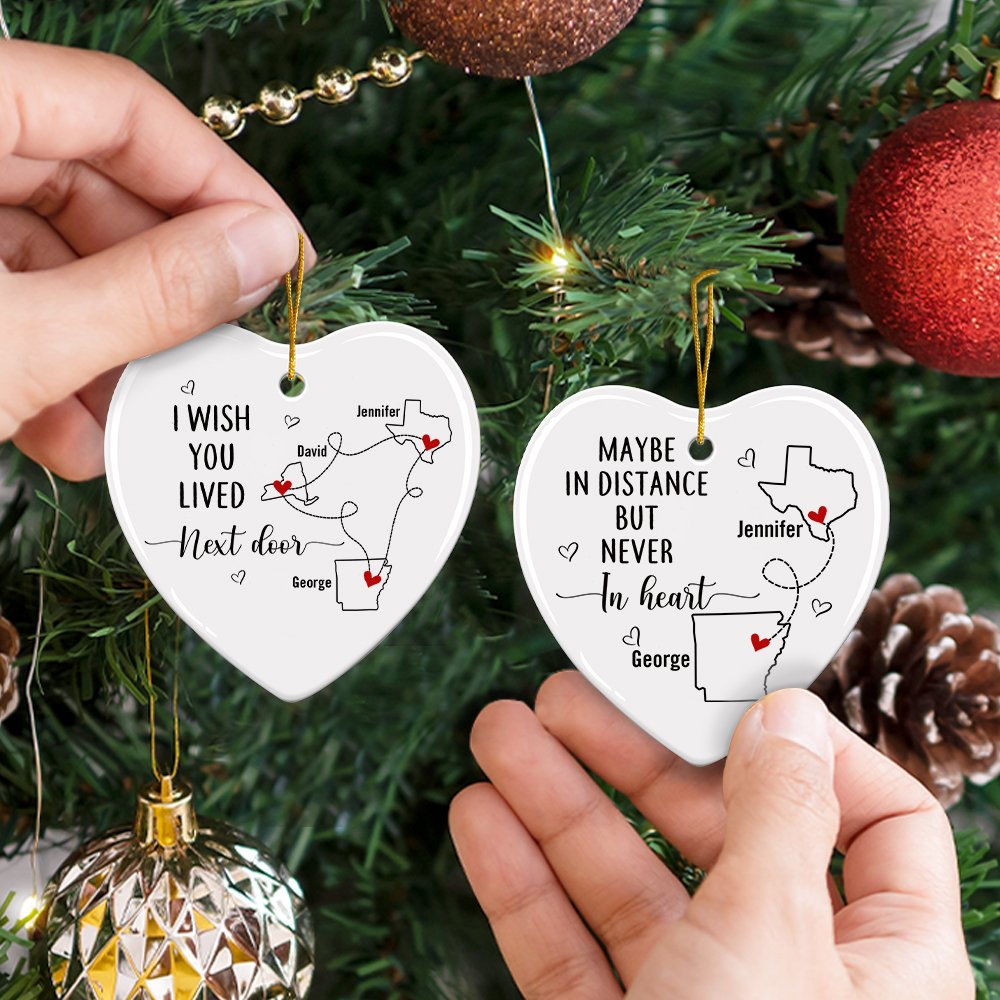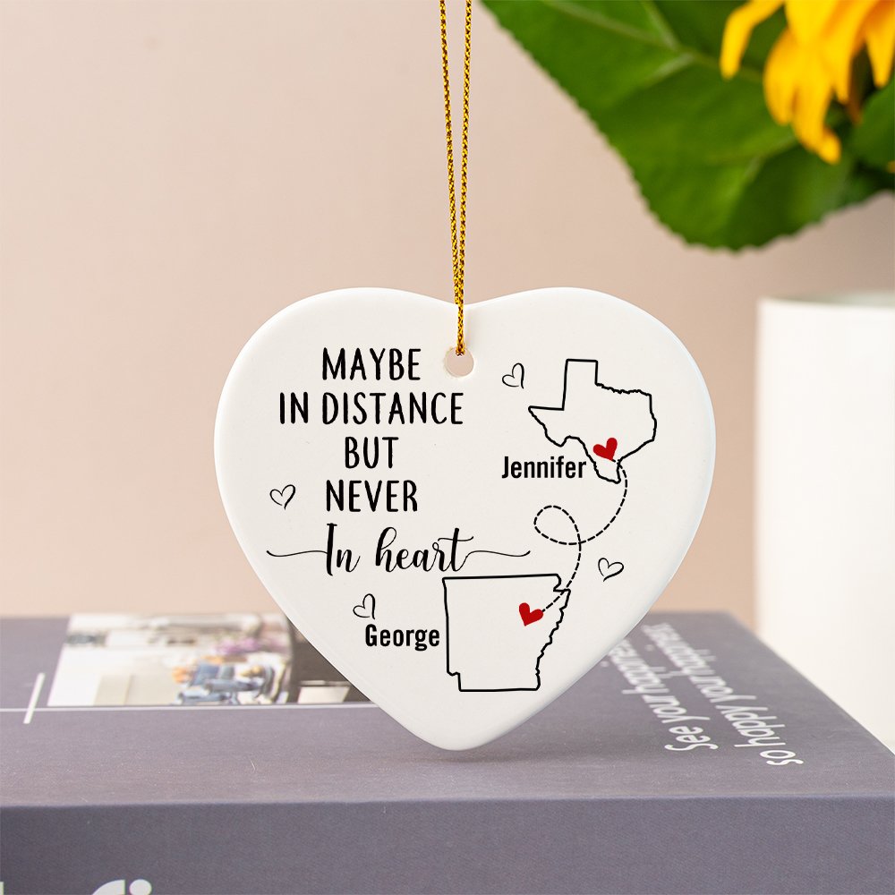 Presenta i contorni di una mappa personalizzata collegati da delicate linee tratteggiate. Il design in ceramica a forma di cuore simboleggia i legami emotivi attraverso le distanze. I nomi personalizzati aggiungono un tocco personale a questo ornamento significativo. È inoltre possibile scegliere tra tre opzioni di scrittura.
