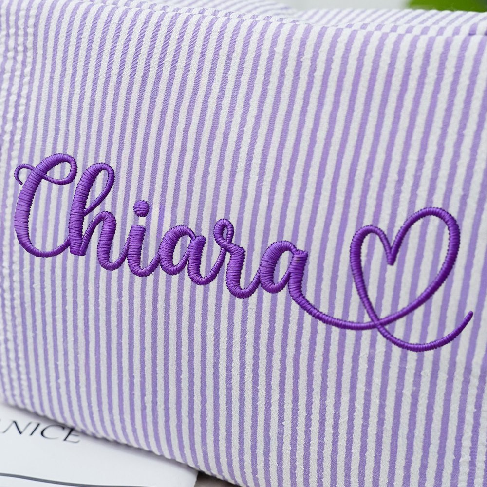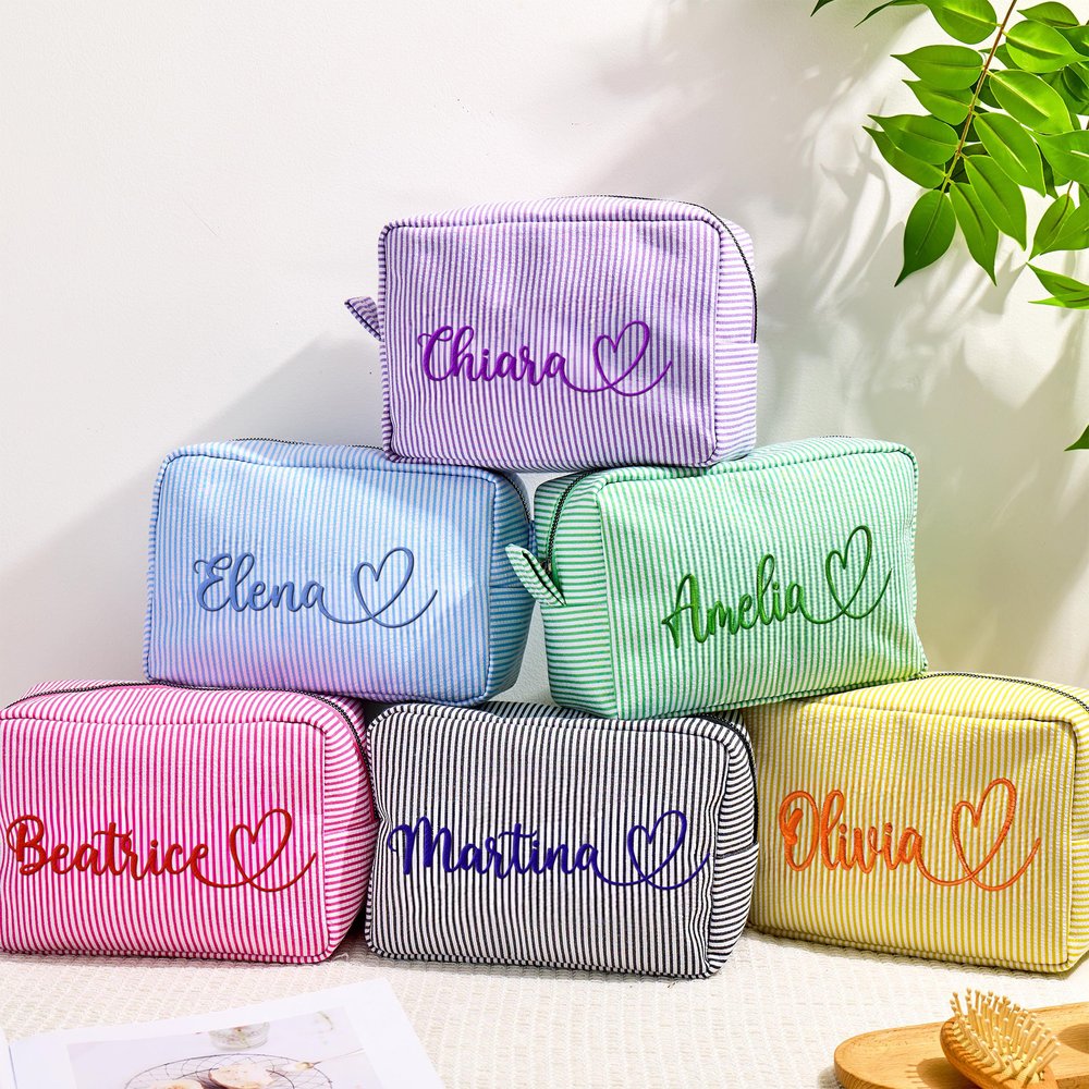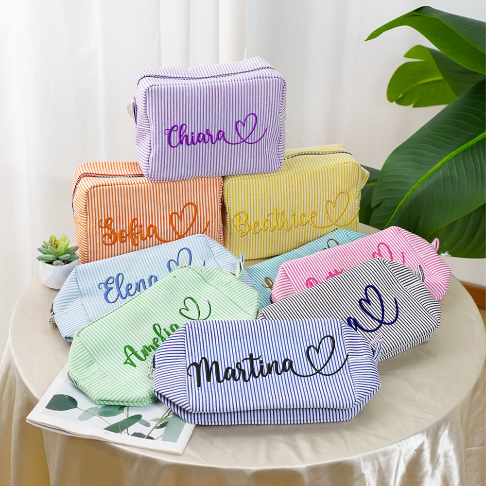 Queste borse da trucco uniscono un motivo a righe giocoso a un ricamo elegante. I colori vivaci, i nomi personalizzati e i dettagli a forma di cuore creano uno stile carino ma raffinato, perfetto per aggiungere un tocco personale alla tua routine di bellezza.