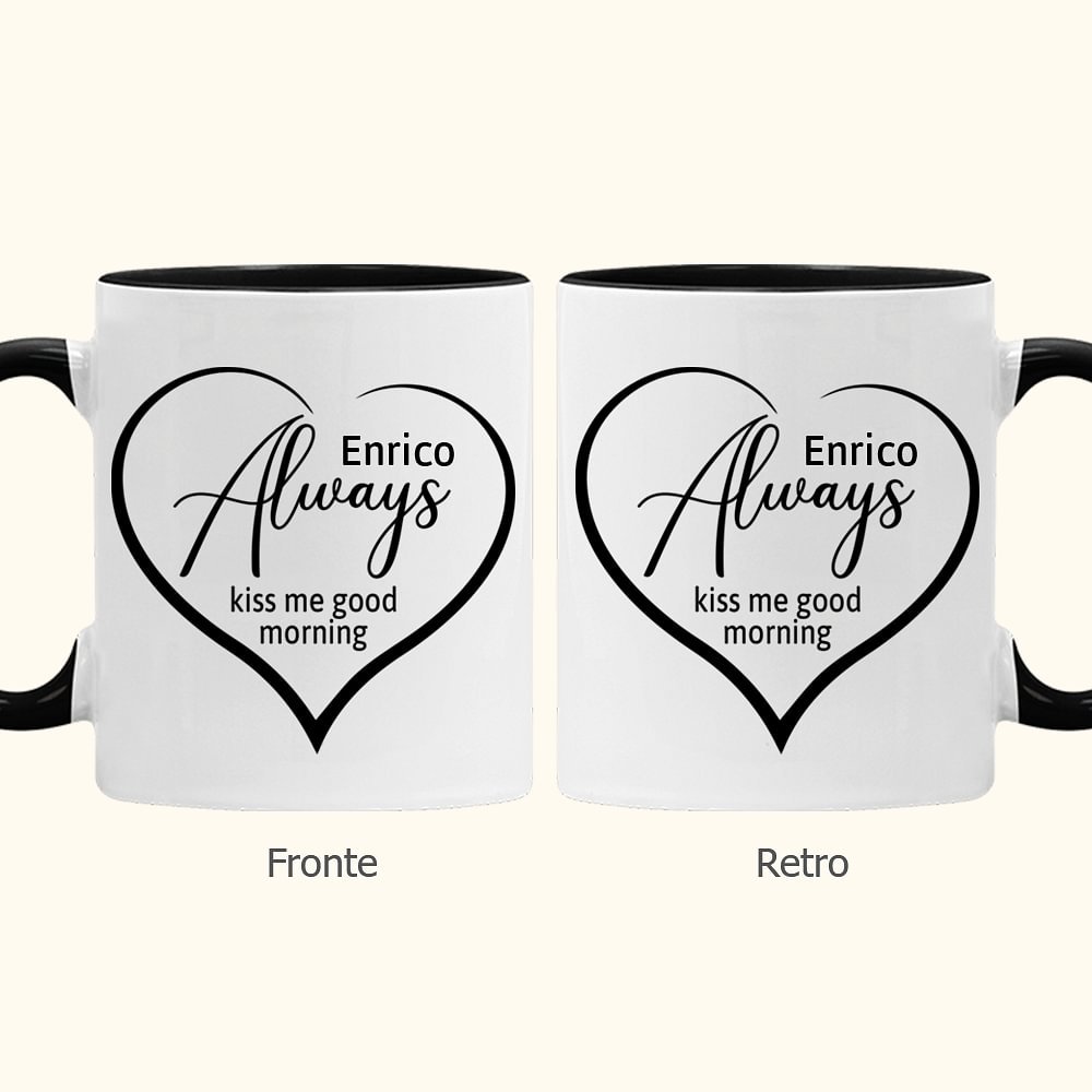La semplice forma a cuore di questa tazza si abbina alla scritta Always Kiss me good morning, il design è semplice ed elegante. È inoltre possibile personalizzare la tazza con il proprio nome. Questo dettaglio personalizzato trasforma la tazza da semplice regalo in un ricordo prezioso,