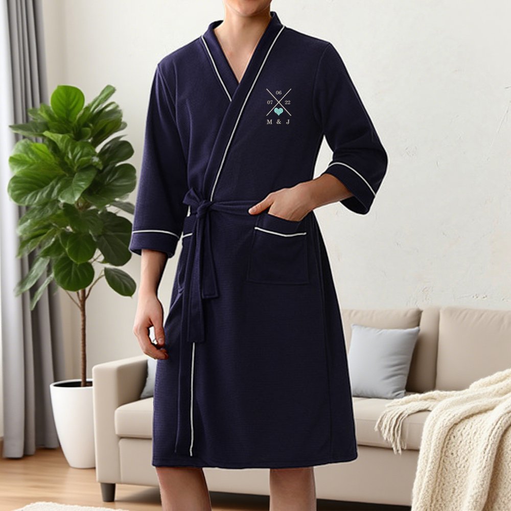 Caratterizzata da un design minimalista con ricami delicati e bordi a contrasto, questa vestaglia emana qualità e raffinatezza. Per le coppie o i coniugi, questo accappatoio può essere ricamato su misura con date significative come l'anniversario di matrimonio, il giorno in cui vi siete conosciuti o altri momenti cari, creando un ricordo romantico duraturo.