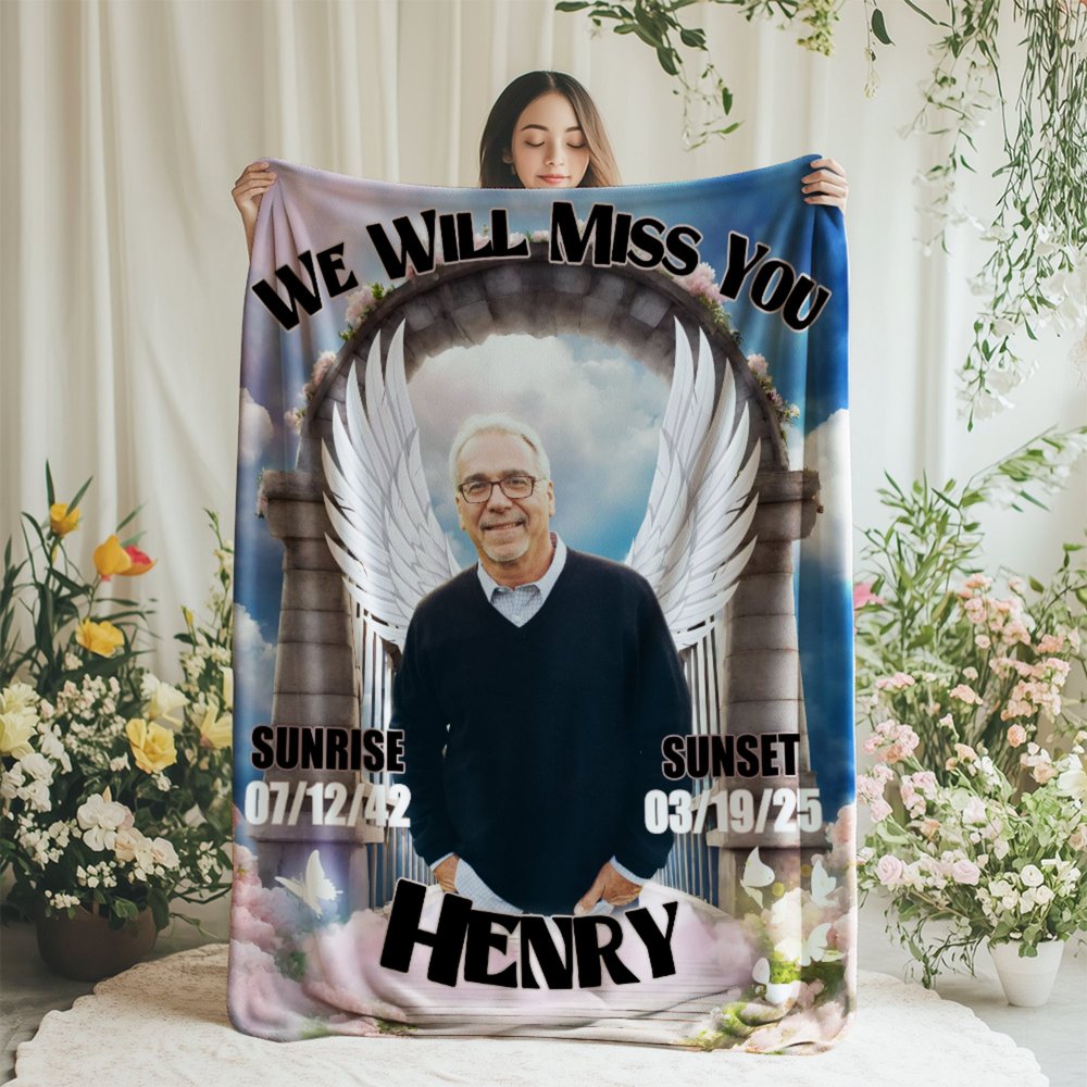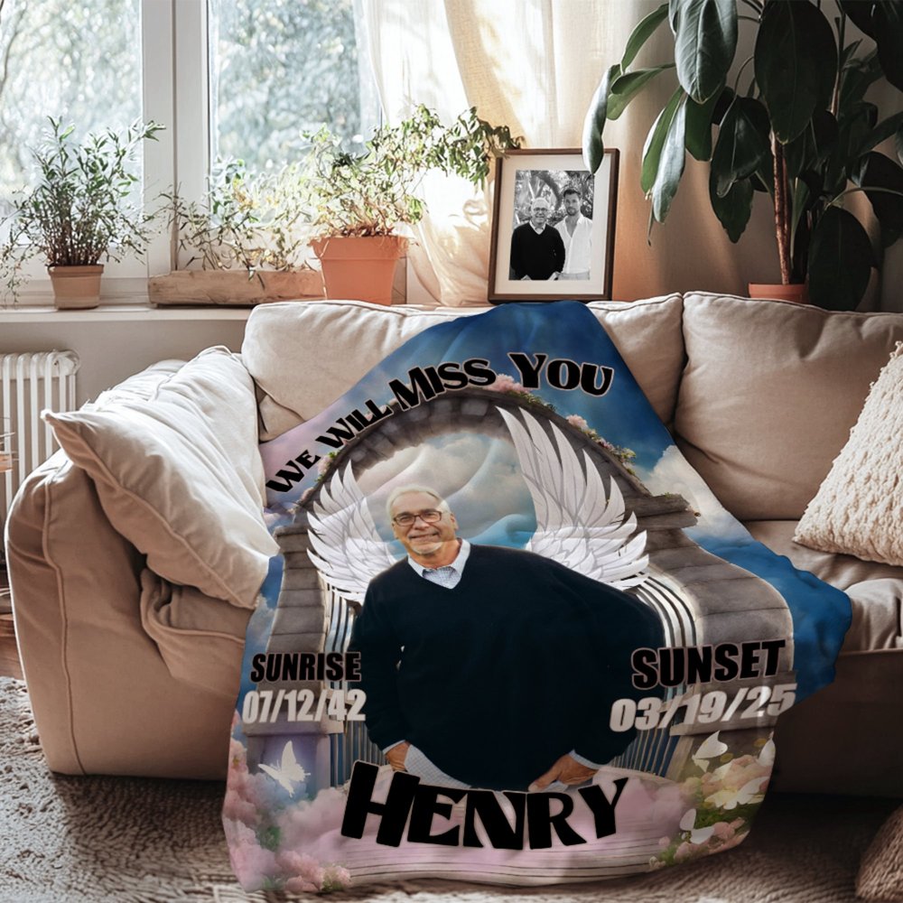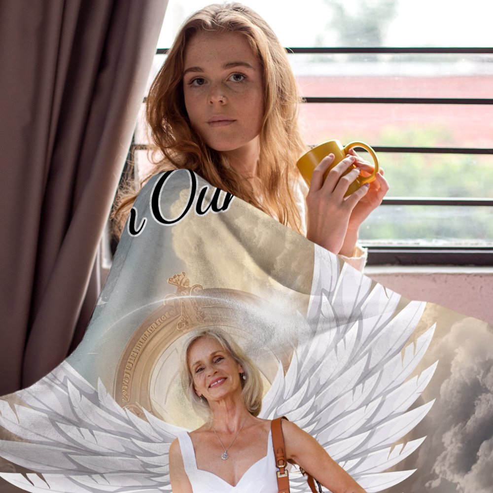 Questa coperta commemorativa personalizzata presenta un bellissimo e sereno sfondo paradisiaco, completo di ali d'angelo e aureola, che crea un'atmosfera pacifica e confortante. È possibile caricare una foto della persona amata e personalizzare il testo commemorativo, il suo nome e le date di nascita e di morte, rendendolo un tributo davvero unico e personalizzato. Il design non è solo visivamente accattivante ma anche profondamente significativo, consentendovi di tenere il ricordo della persona amata vicino al vostro cuore.