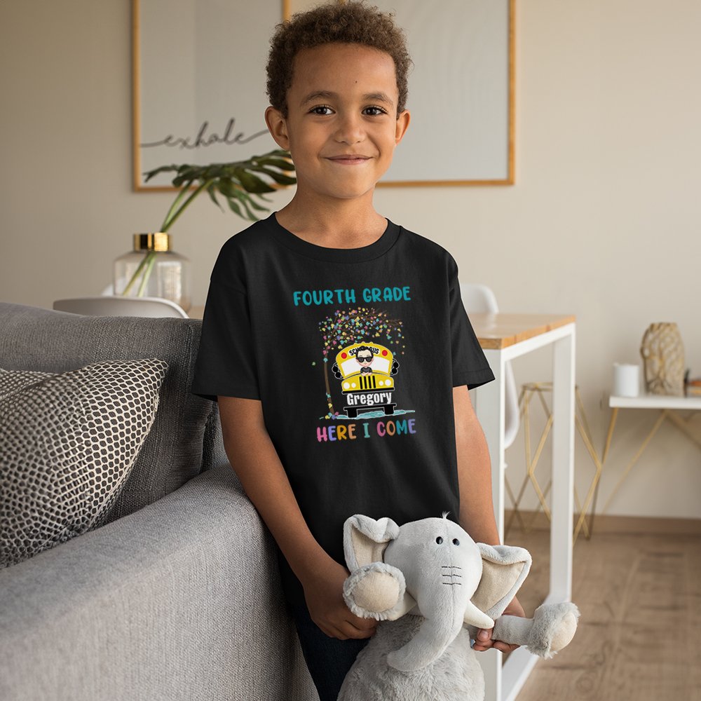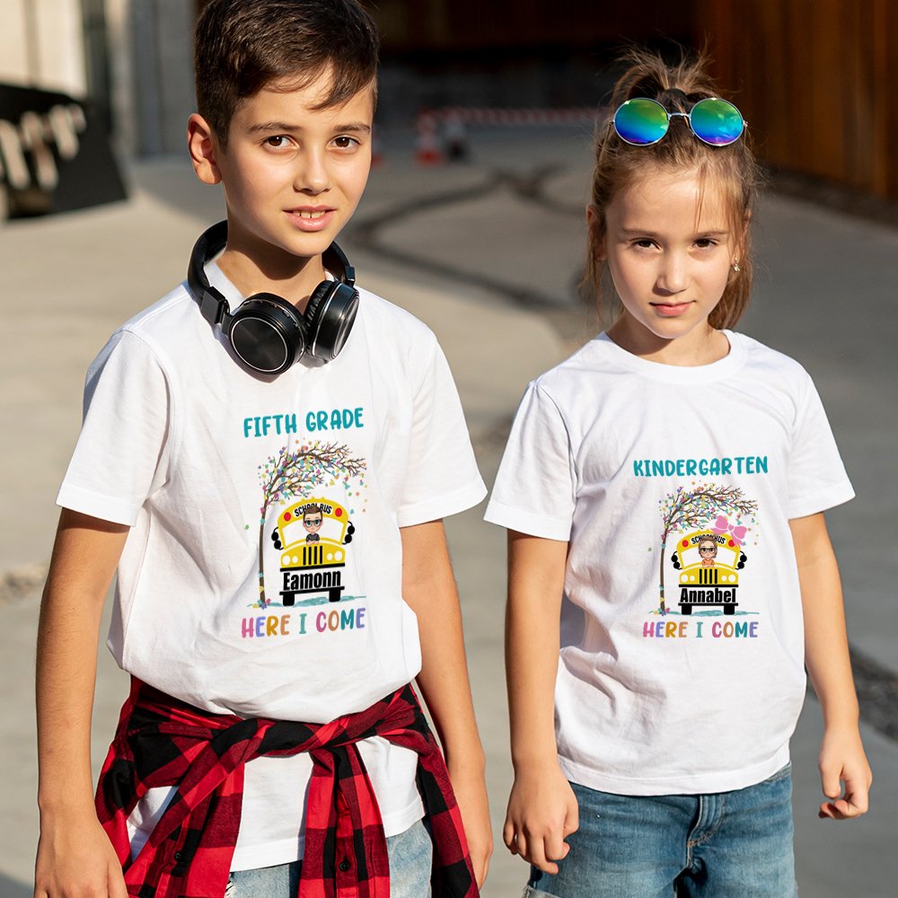Maglietta personalizzata Here I Come School Bus Kid Ritorno a scuola Primo giorno di scuola Regalo di celebrazione per ragazzo ragazza
