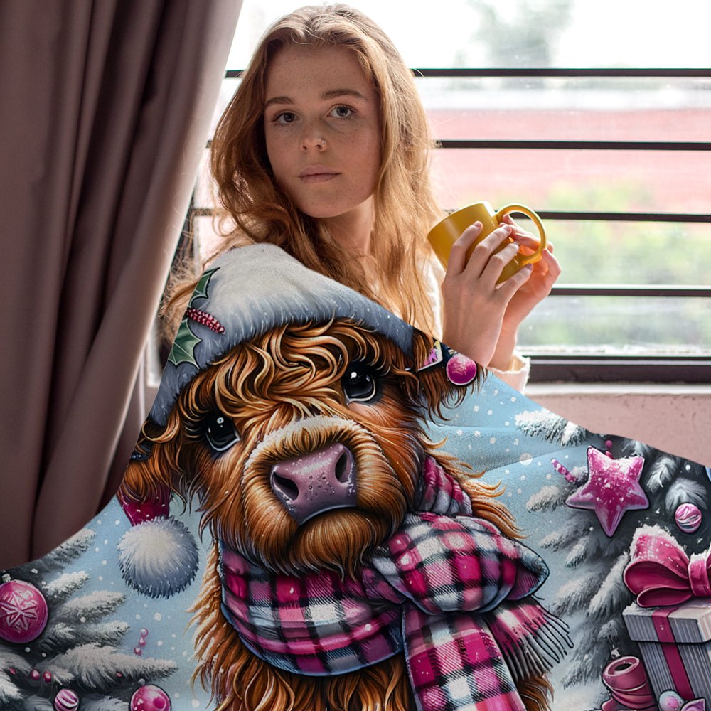 La coperta presenta un esclusivo motivo di mucca highland stampato su di essa. La simpatica mucca highland indossa un cappello da Babbo Natale in una nevosa giornata invernale, conferendo una forte atmosfera natalizia. La coperta offre molto calore e una grande esperienza, è morbida e setosa ed è leggera. È perfetta per accoccolarsi in una nevosa giornata invernale o per aggiungere un tocco di comfort a una serata estiva.