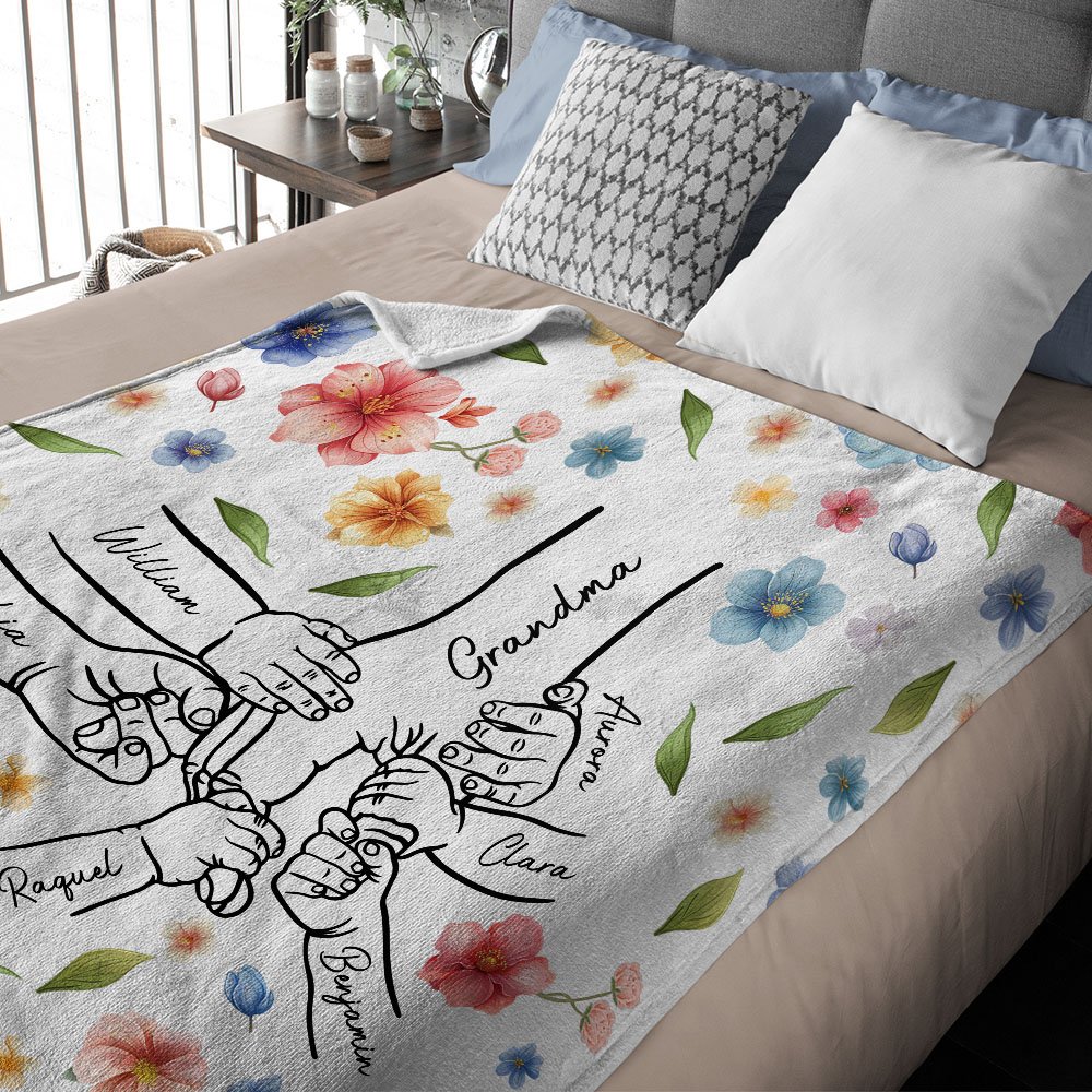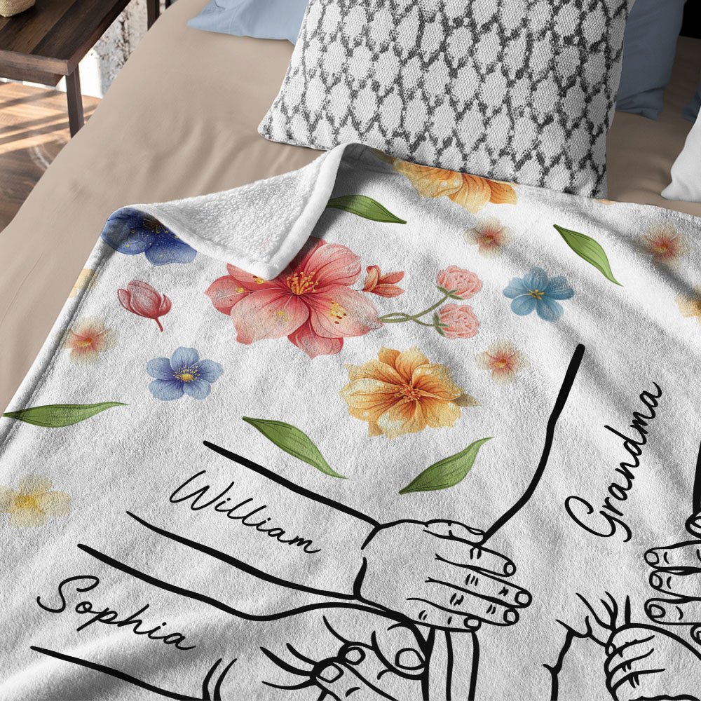 The hand-holding blanket is a heartfelt and unique gift that symbolizes the unbreakable bond between a mother or grandmother and her children or grandchildren. You have the option to personalize it with 1 to 9 names of children and each hand represents a cherished family member, making it a truly special and personalized keepsake.