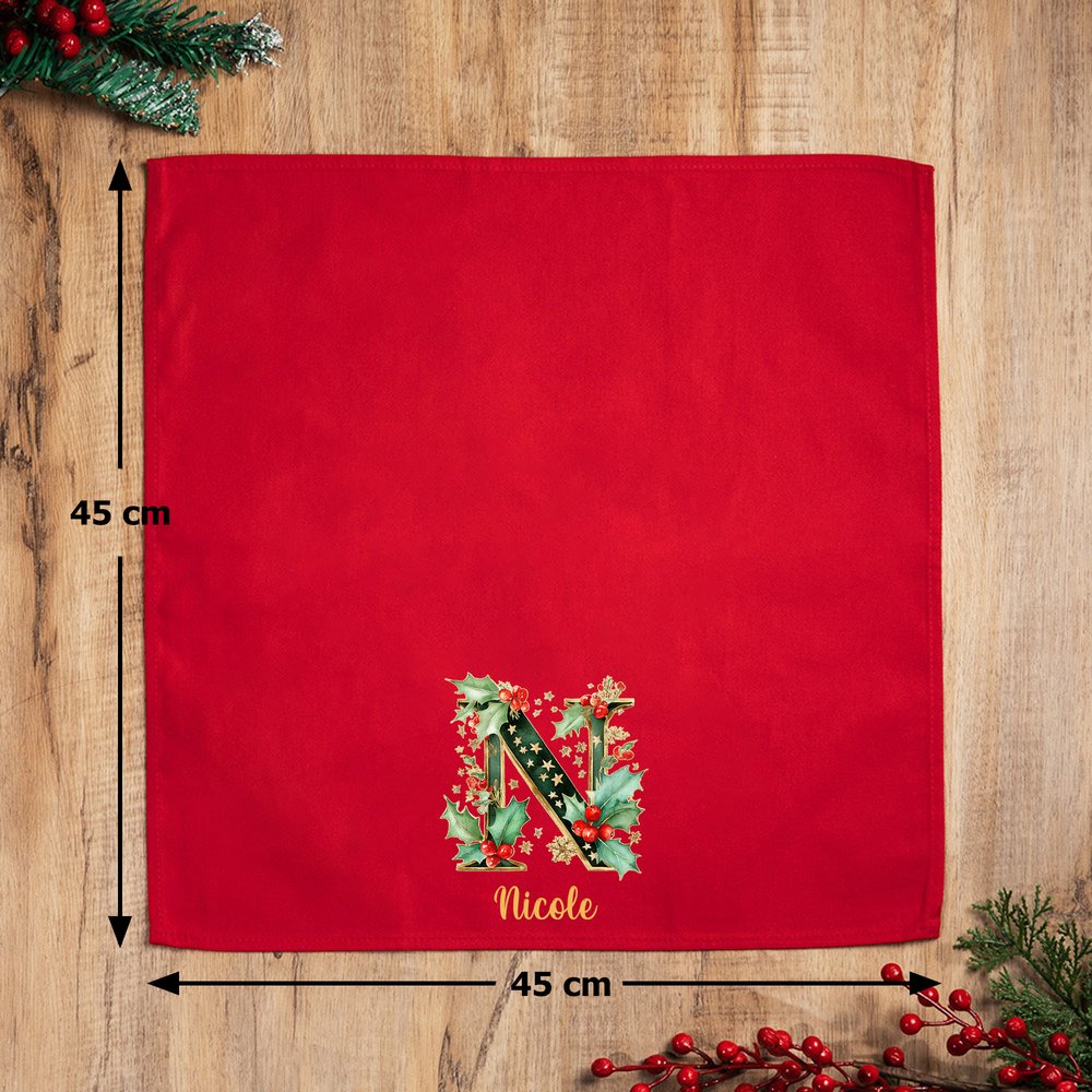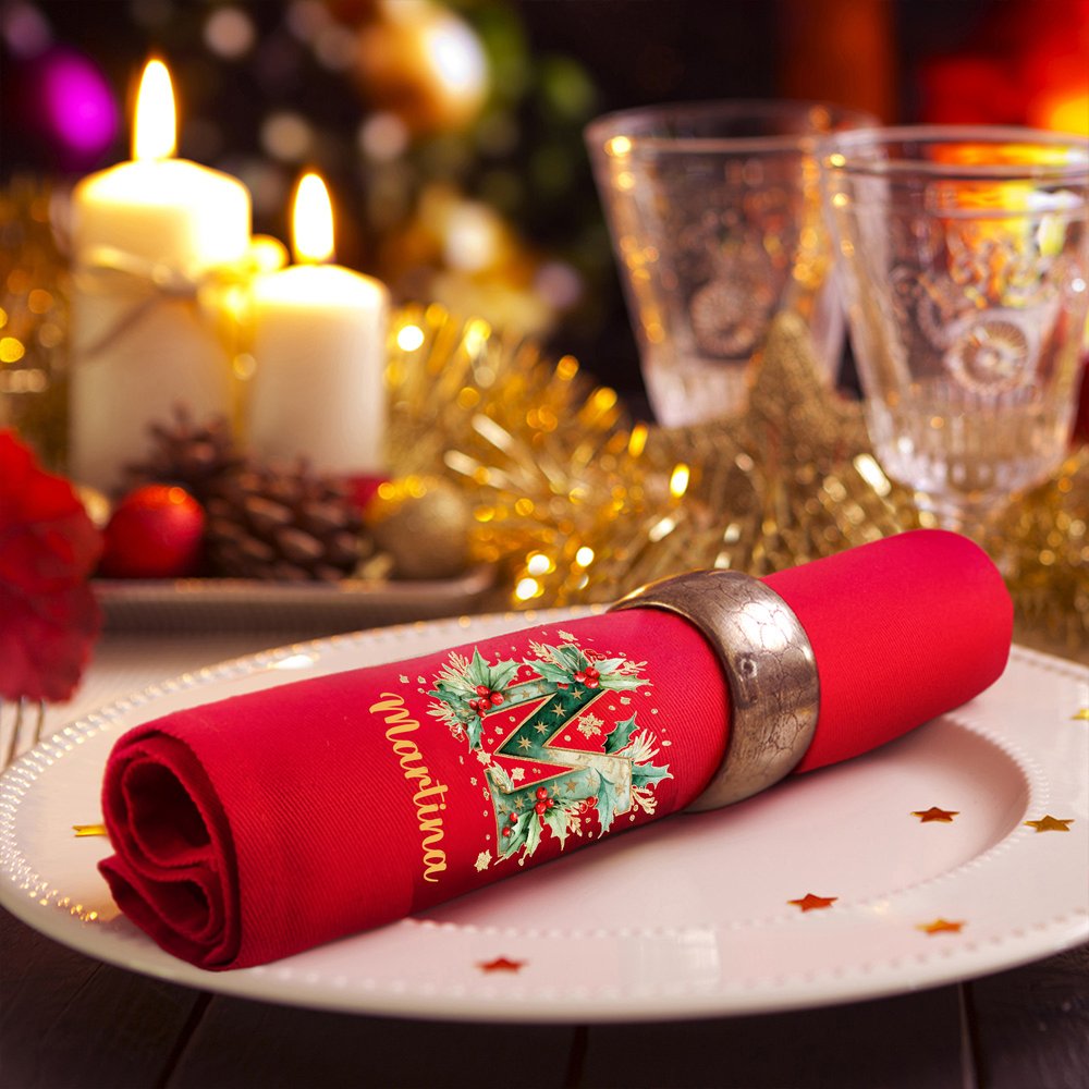 Questi tovaglioli presentano iniziali e nomi natalizi personalizzabili, decorati con agrifoglio ed elementi festivi. Donano alla tavola di Natale un tocco personale e giocoso, rendendo ogni pasto ancora più speciale.