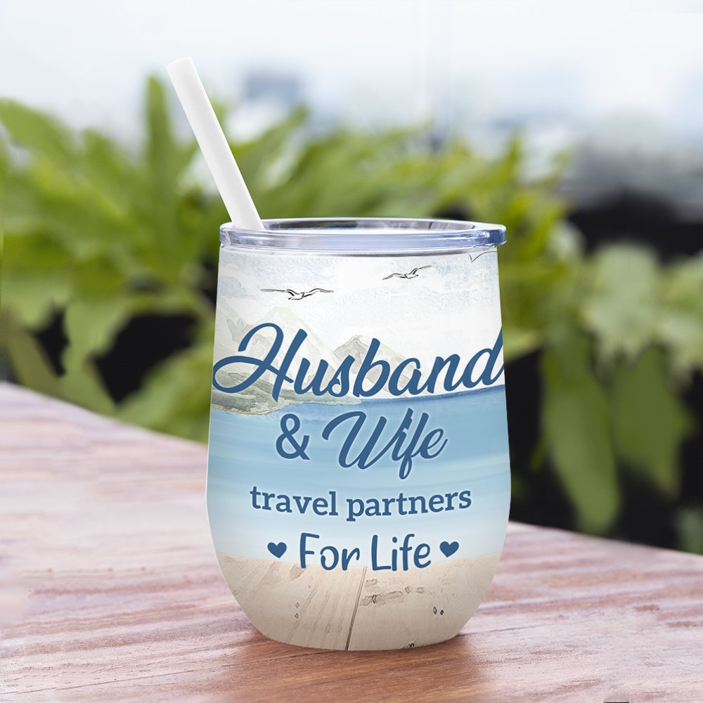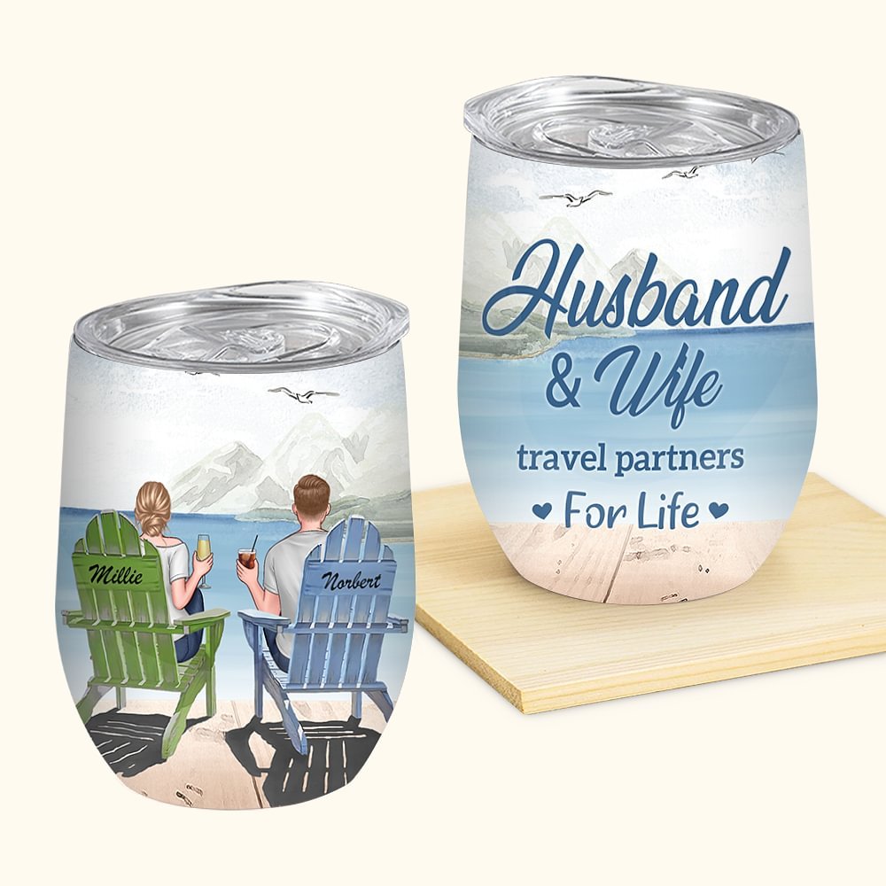 Marito e moglie personalizzati si godono la vita viaggiando insieme, compleanno del gabbiano e bicchiere di vino con effetto isolante
