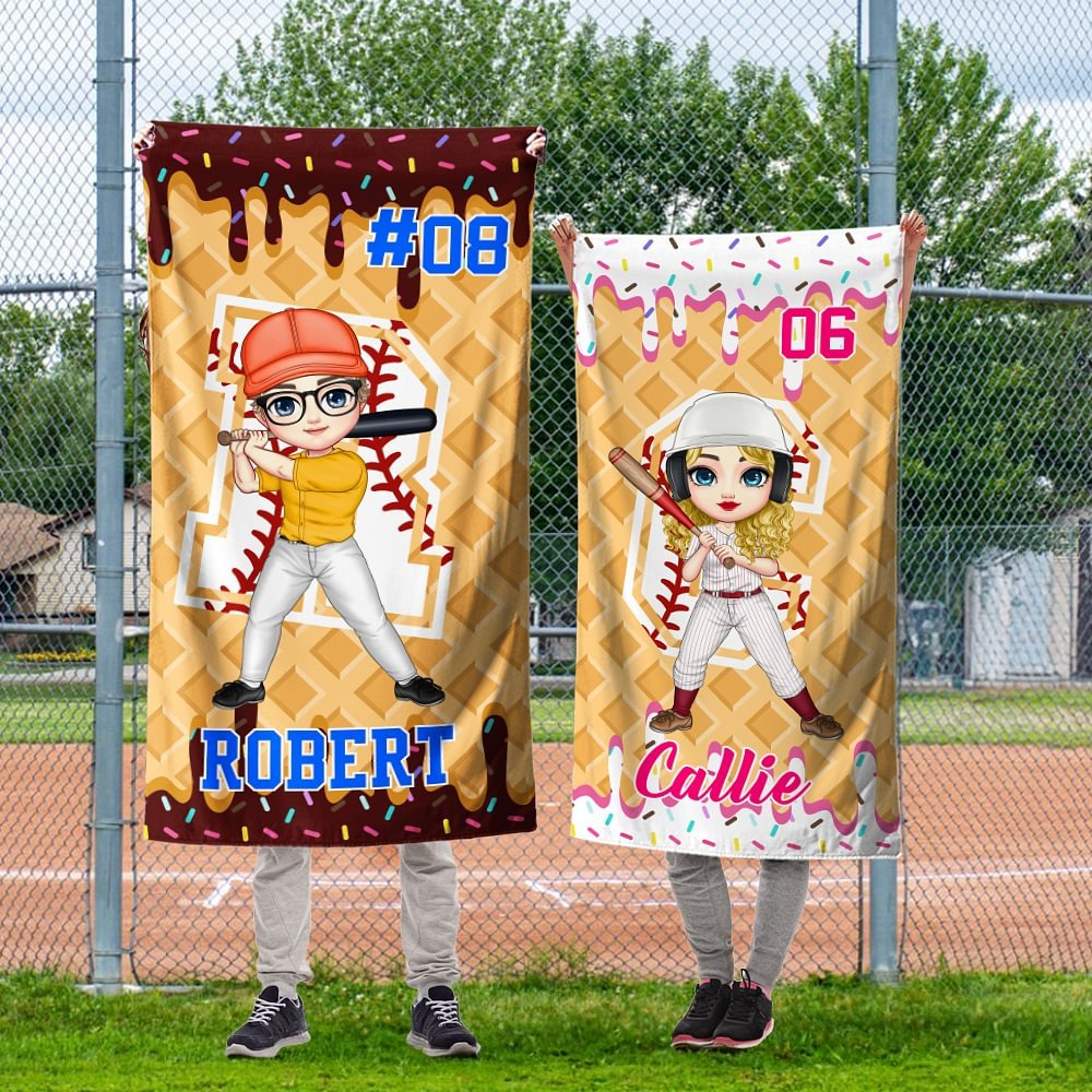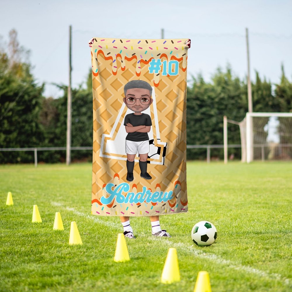 I nostri teli da mare presentano un divertente personaggio dei cartoni animati in stile baseball o football con uno sfondo colorato di gelato che cola. È possibile personalizzare il personaggio e aggiungere le iniziali con un motivo a palline e aggiungere il nome e il numero di maglia del destinatario per creare un regalo unico e personalizzato.