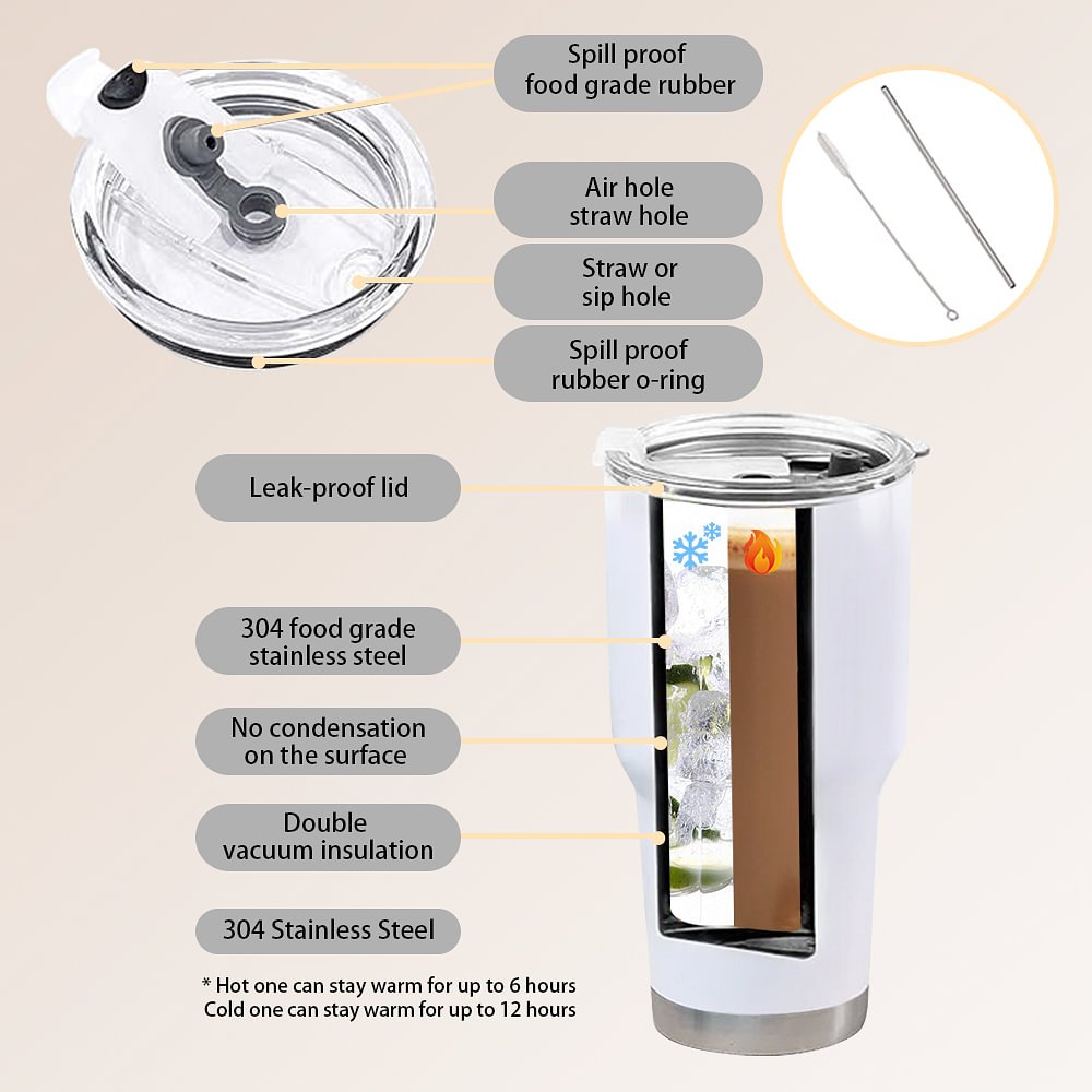 Con una capacità di 30 once, questo tumbler offre ampio spazio per la vostra bevanda preferita. Che si tratti di caffè mattutino, tè freddo o acqua, questo tumbler può contenere una quantità d'acqua sufficiente a mantenervi idratati per tutto il giorno.