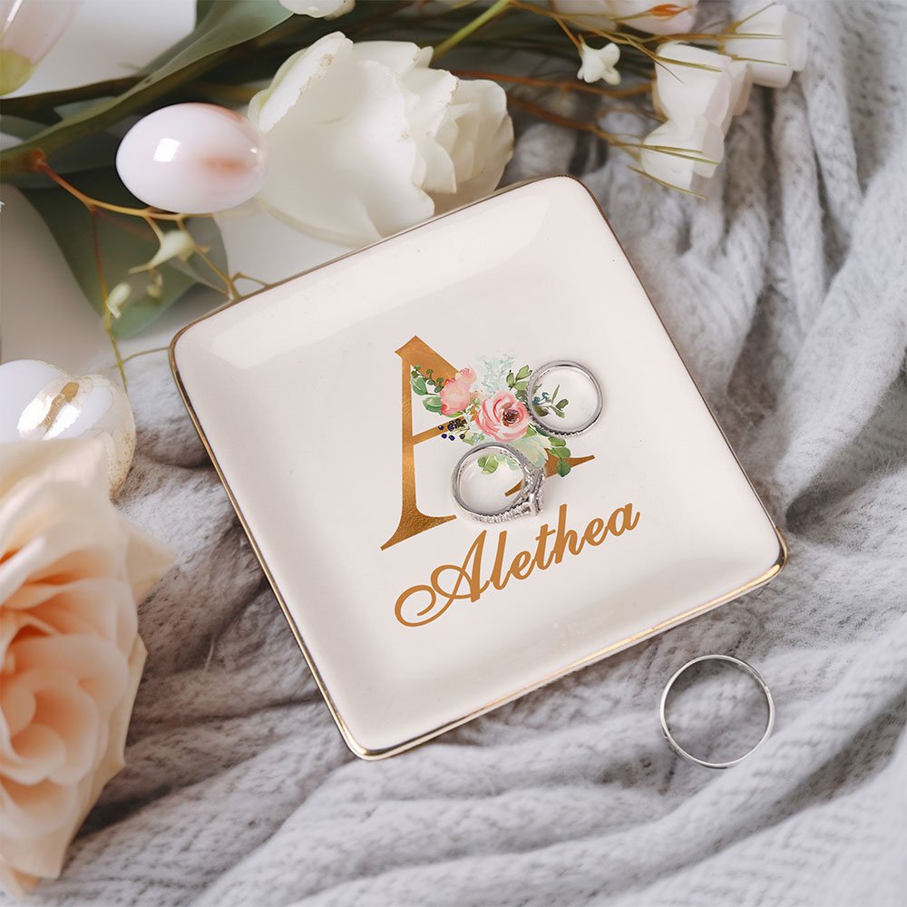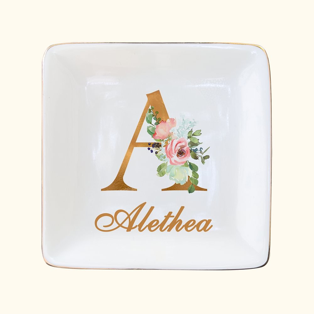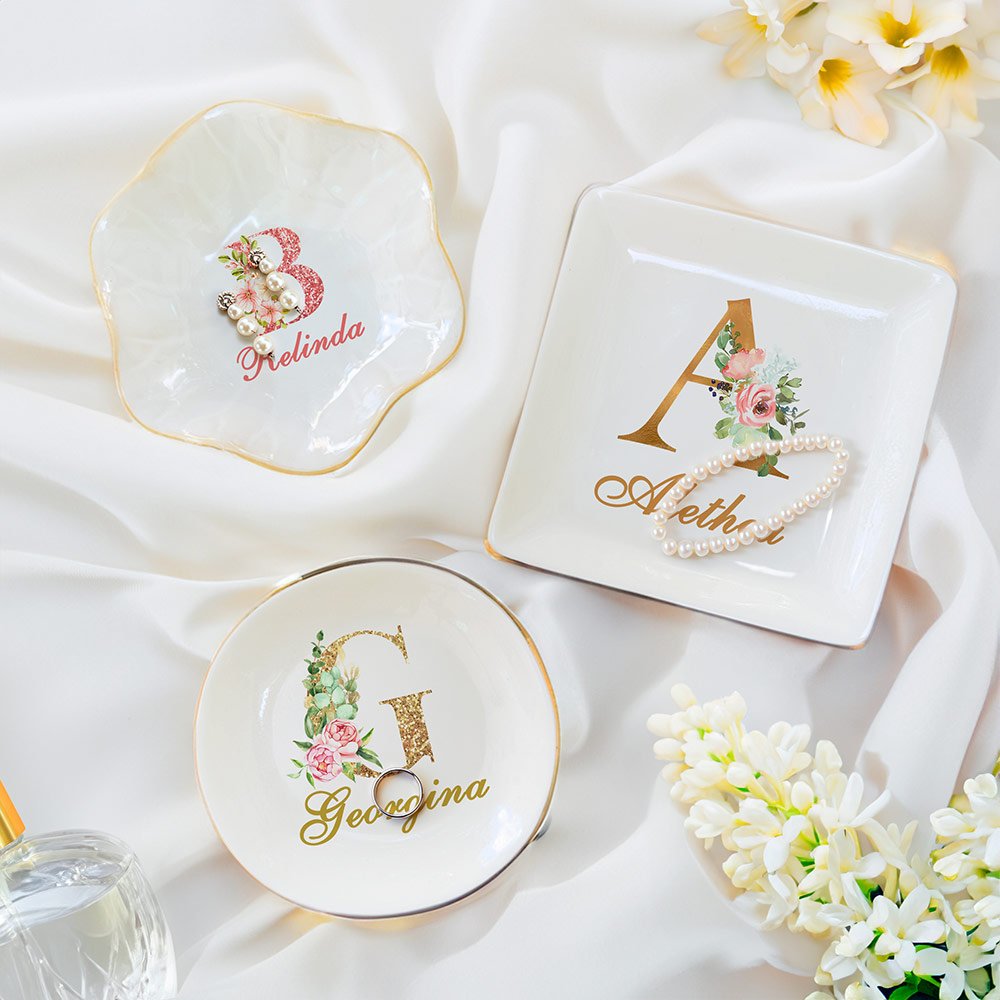 Questo vassoio per gioielli con iniziale è realizzato in ceramica smaltata di alta qualità, che gli conferisce un aspetto elegante e sofisticato che si adatta a qualsiasi arredamento. È disponibile in tre forme: rotonda, quadrata e a fiore. Ogni vassoio presenta un bordo color oro e può essere personalizzato con un nome e lo stile floreale dell'iniziale del nome. Il vassoio è confezionato in una scatola regalo, pronto per essere regalato.