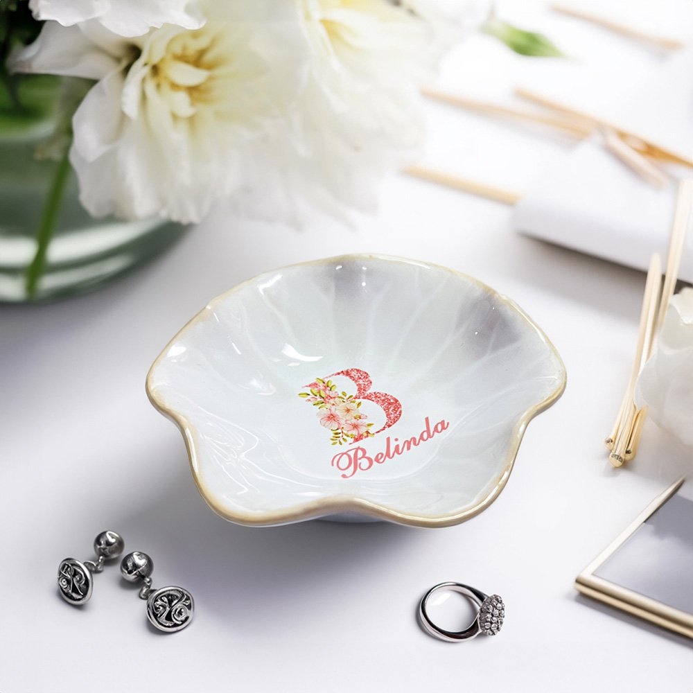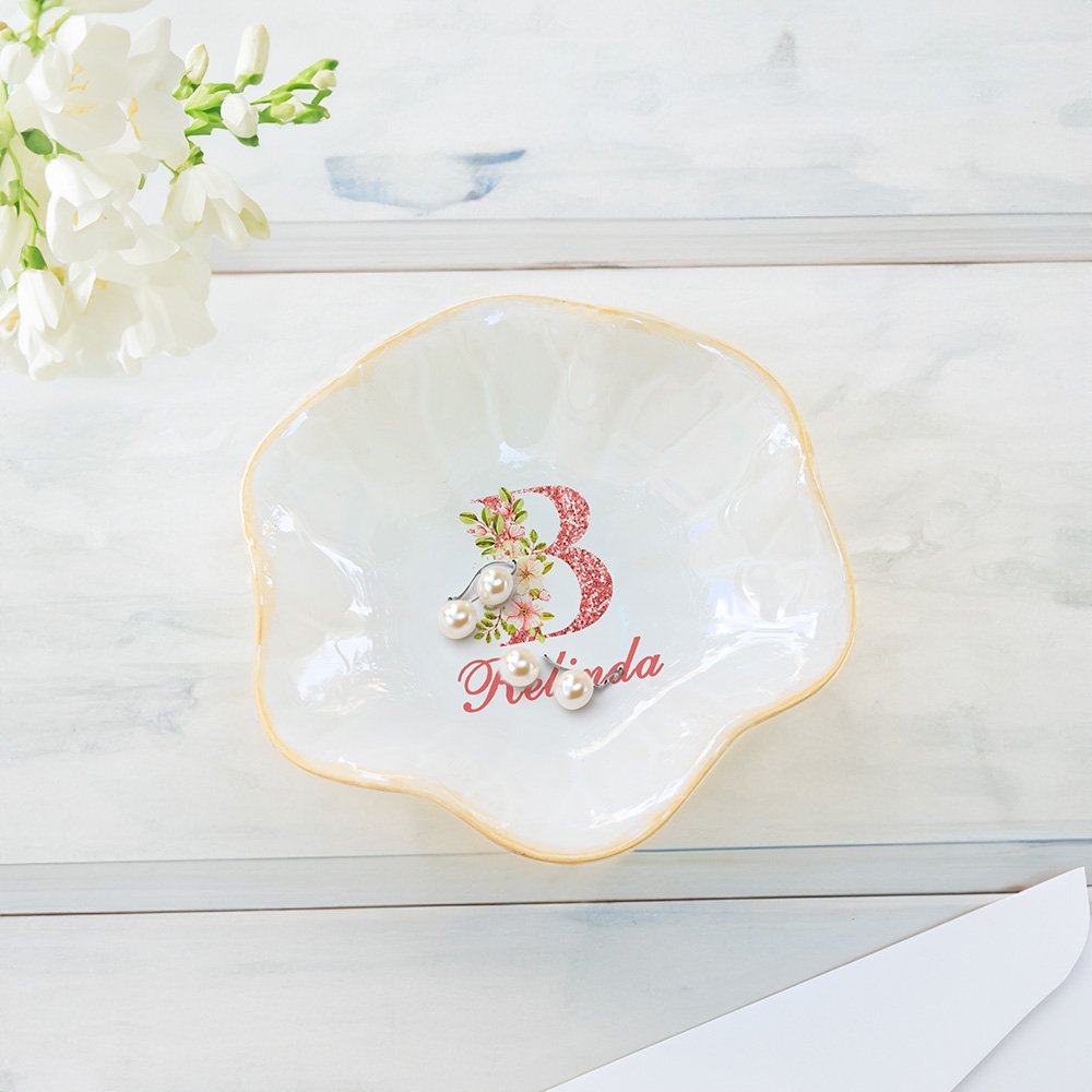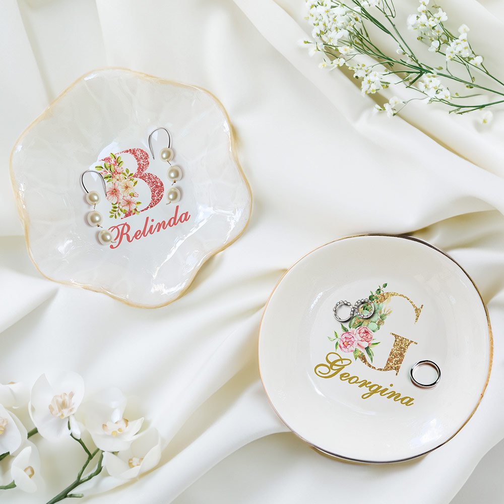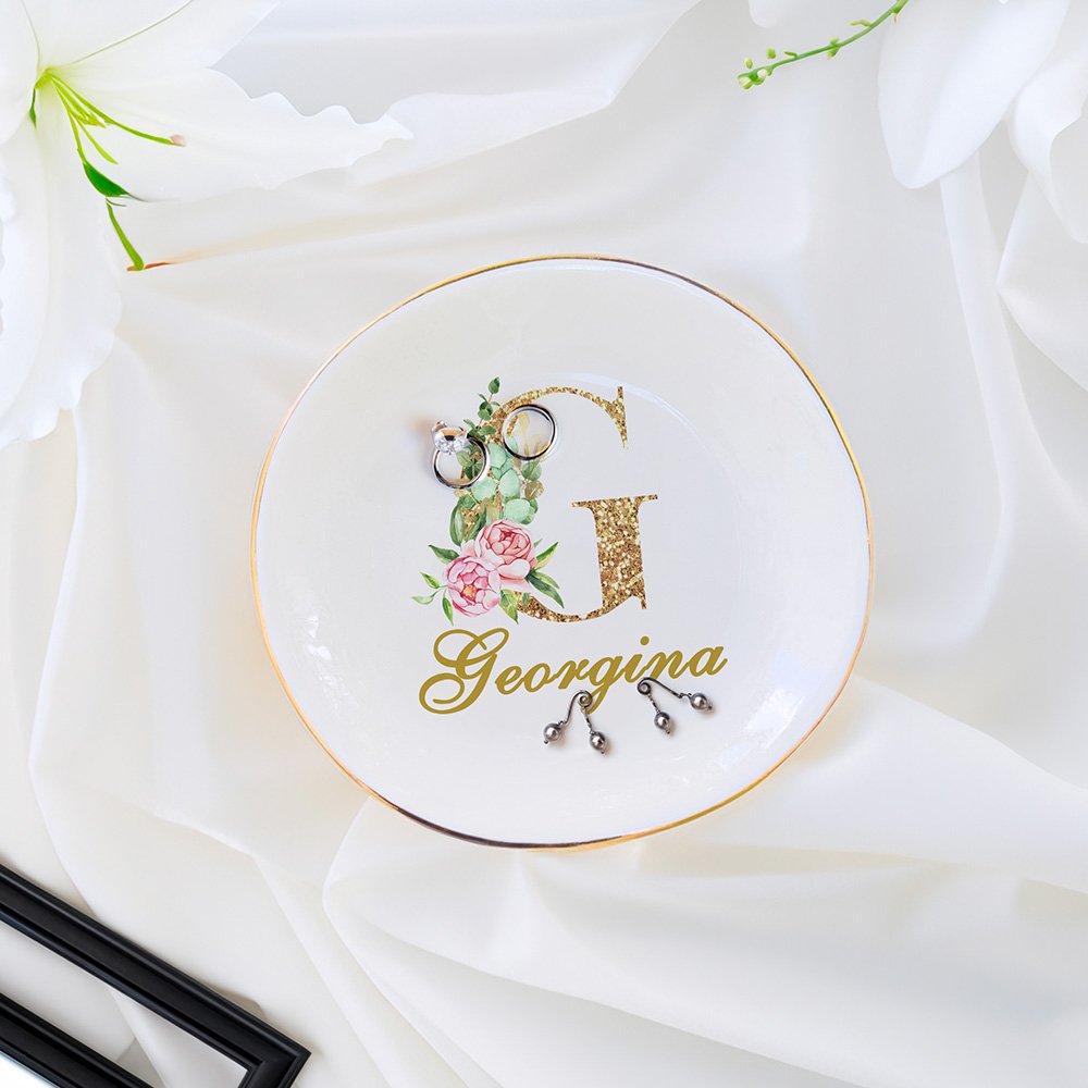 Questo vassoio per gioielli con iniziale è realizzato in ceramica smaltata di alta qualità, che gli conferisce un aspetto elegante e sofisticato che si adatta a qualsiasi arredamento. È disponibile in tre forme: rotonda, quadrata e a fiore. Ogni vassoio presenta un bordo color oro e può essere personalizzato con un nome e lo stile floreale dell'iniziale del nome. Il vassoio è confezionato in una scatola regalo, pronto per essere regalato.