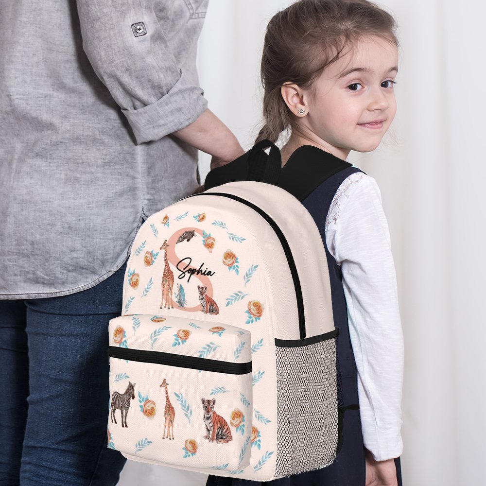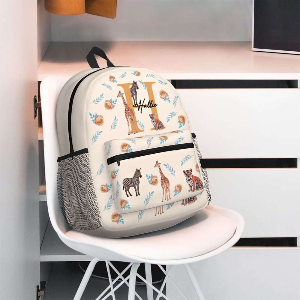 Questo zaino presenta adorabili e giocosi disegni di giraffe, zebre e tigri che i bambini adoreranno. Disponibile nelle varianti arancione, rosa e blu, questo zaino può essere personalizzato con il nome e le iniziali del bambino, rendendolo un oggetto davvero speciale e unico.