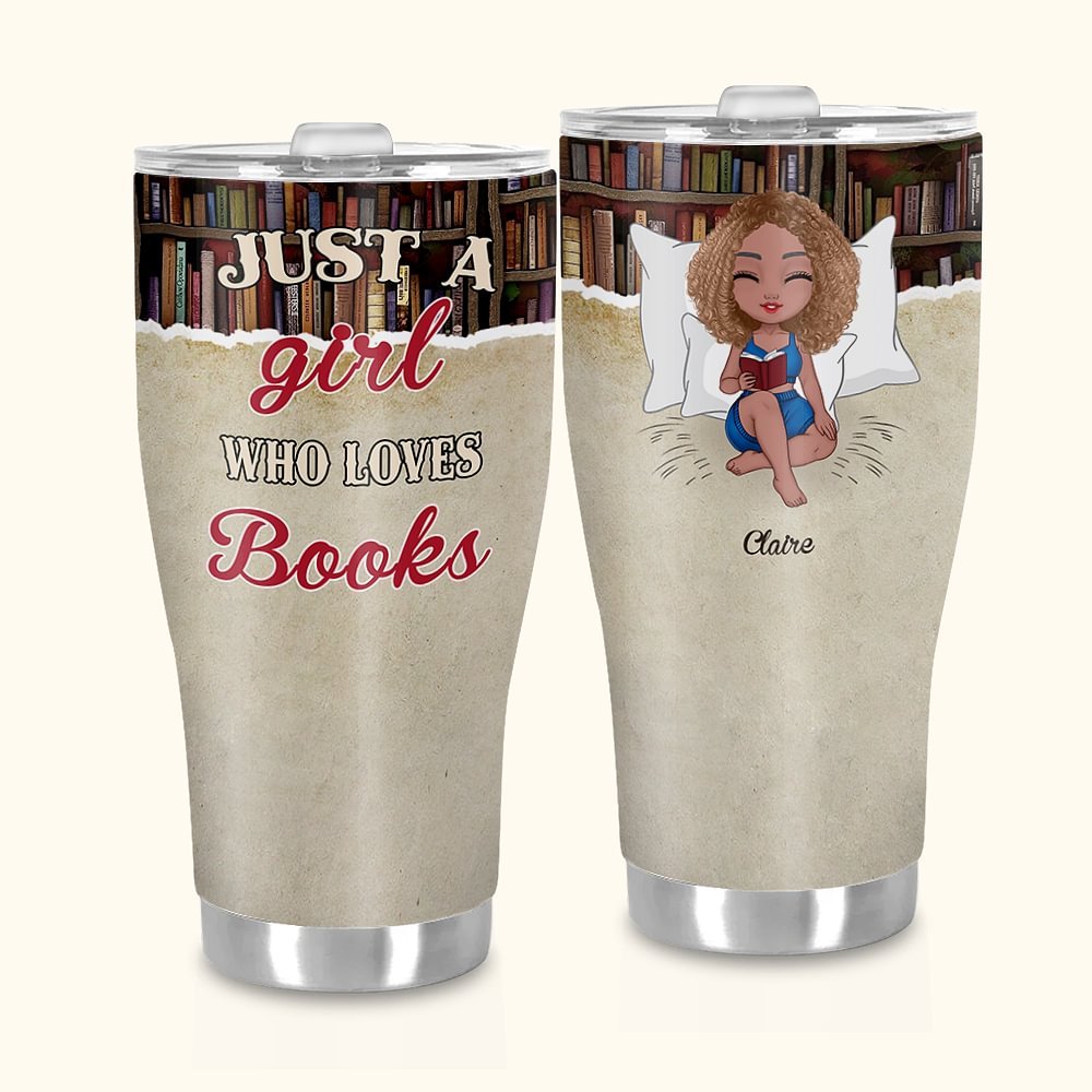 Il design di questo bicchiere riflette l'amore di una ragazza per i libri. La frase "Just a girl who loves books" è elegantemente stampata sulla superficie e si può disegnare l'immagine di una ragazza che legge un libro.